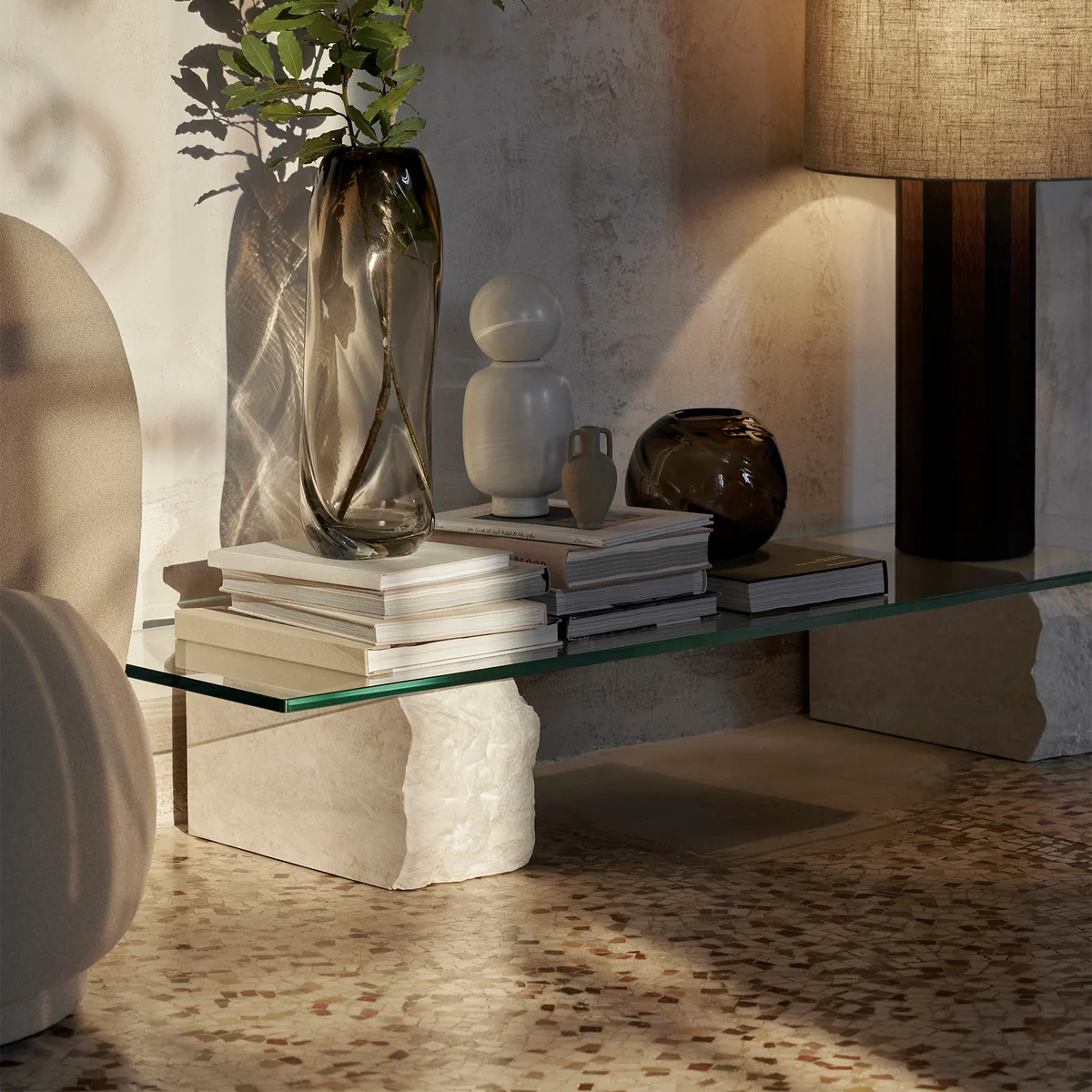 Couchtisch mit Marmor-Blöcken und Glasplatte