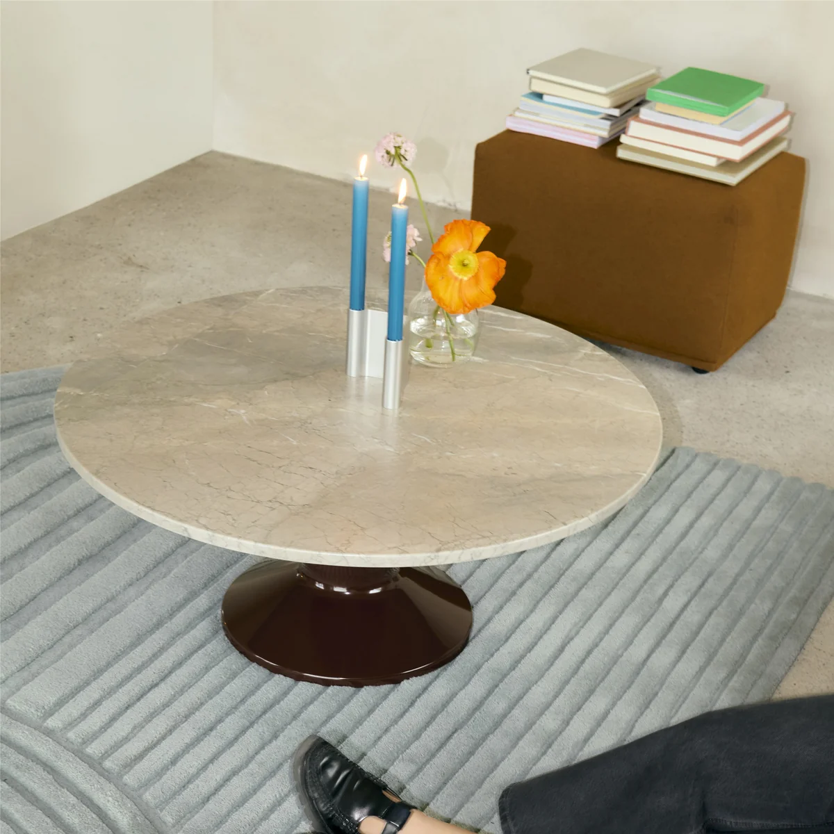 Der Midst Couchtisch von Muuto erscheint wie ein ruhender Mittelpunkt im Raum: Sein rundes Gestell fängt das Licht ein und gibt ihm eine sanfte Spiralbewegung, während die massive Marmorplatte darüber wie ein ruhiger Himmelskörper wirkt. Die Natursteintöne offenbaren bei jeder Betrachtung neue, subtile Details.