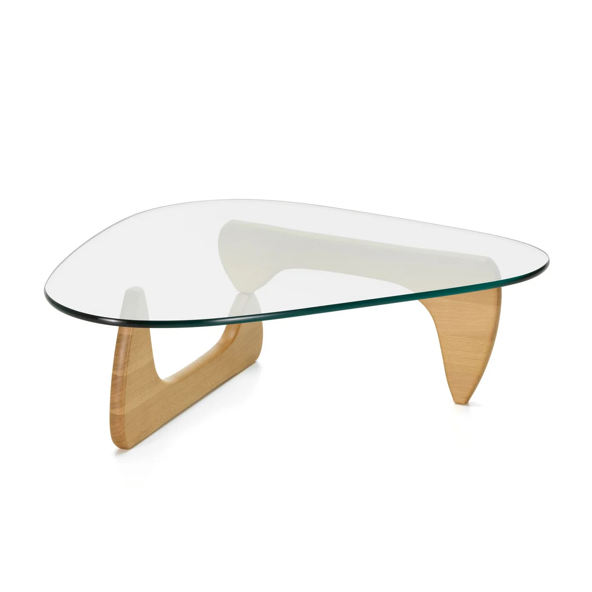 Der Coffee Table übersetzt die biomorphe Formensprache der Plastiken des Bildhauers und Designers Isamu Noguchi in einen skulpturalen Couchtisch. Wohl deshalb nannte Noguchi selbst den Tisch seinen besten Möbelentwurf. Zwei im rechten Winkel zueinander stehende Holzbeine, die in schwarzer Esche, Ahorn und Nussbaum erhältlich sind, tragen die schwere, robuste Glasplatte.