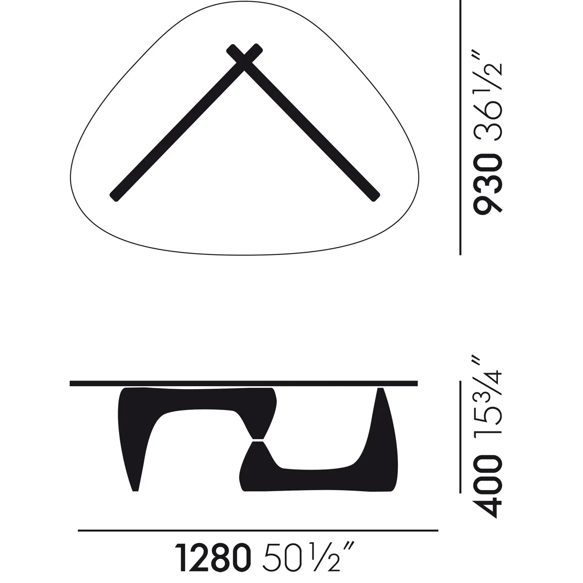 Noguchi selbst bezeichnete den Coffee Table als seinen besten Möbelentwurf, wohl auch, weil er sehr an seine damaligen Plastiken aus Bronze und Marmor erinnert und ihre biomorphe Formensprache unverfälscht in ein skulpturales Möbel umsetzt: auf zwei identischen, im rechten Winkel versetzten Holzelementen ruht eine schwere Glasplatte.