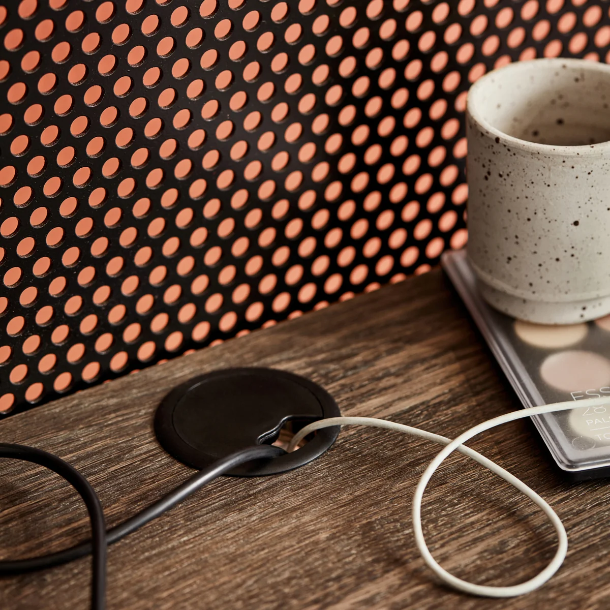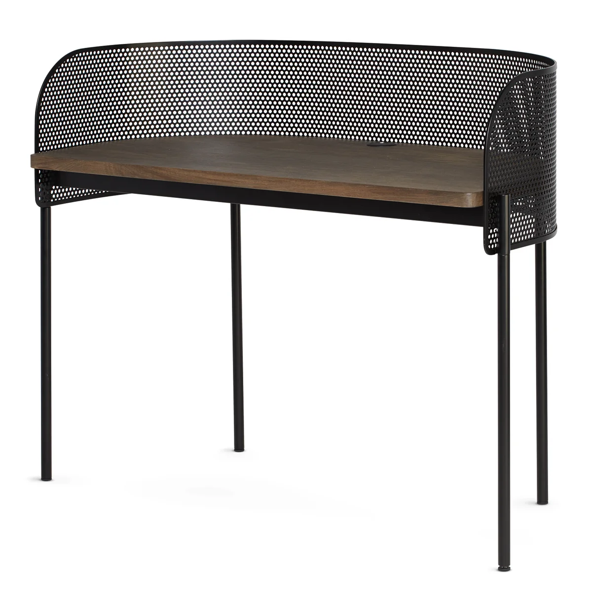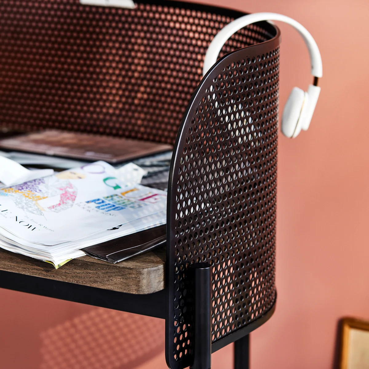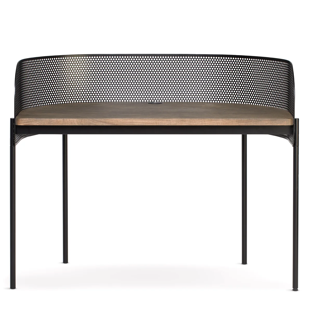 Das Design ist erfrischend minimalistisch und zeichnet sich durch ein filigranes Stahlgestell mit vier schmalen Beinen aus, auf dem eine halbkreisförmige Tischplatte aus geräuchertem Eichenfurnier thront. Umfasst wird die Platte von einem perforierten Lochblech, das die arbeitende Person ein wenig vor äußeren Einflüssen abschirmen soll. Zudem eignet sich diese Rückwand auch hervorragend, um Notizen anzuheften, die Kopfhörer darüber zulegen oder um Magnete anzupinnen.