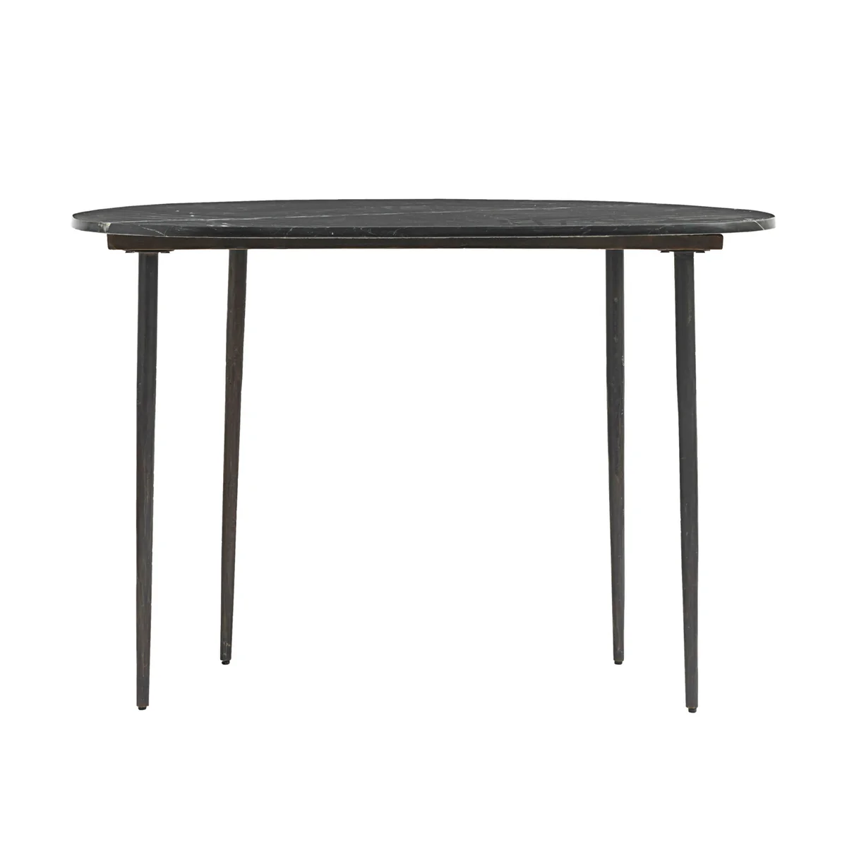 Der Eda Schreibtisch von House Doctor verleiht Ihrem Arbeitsbereich eine stilvolle und moderne Ausstrahlung. Die ovale Tischplatte aus dunklem Marmor sorgt für einen besonderen Look und macht jedes Exemplar durch die natürliche Maserung des Steins einzigartig.