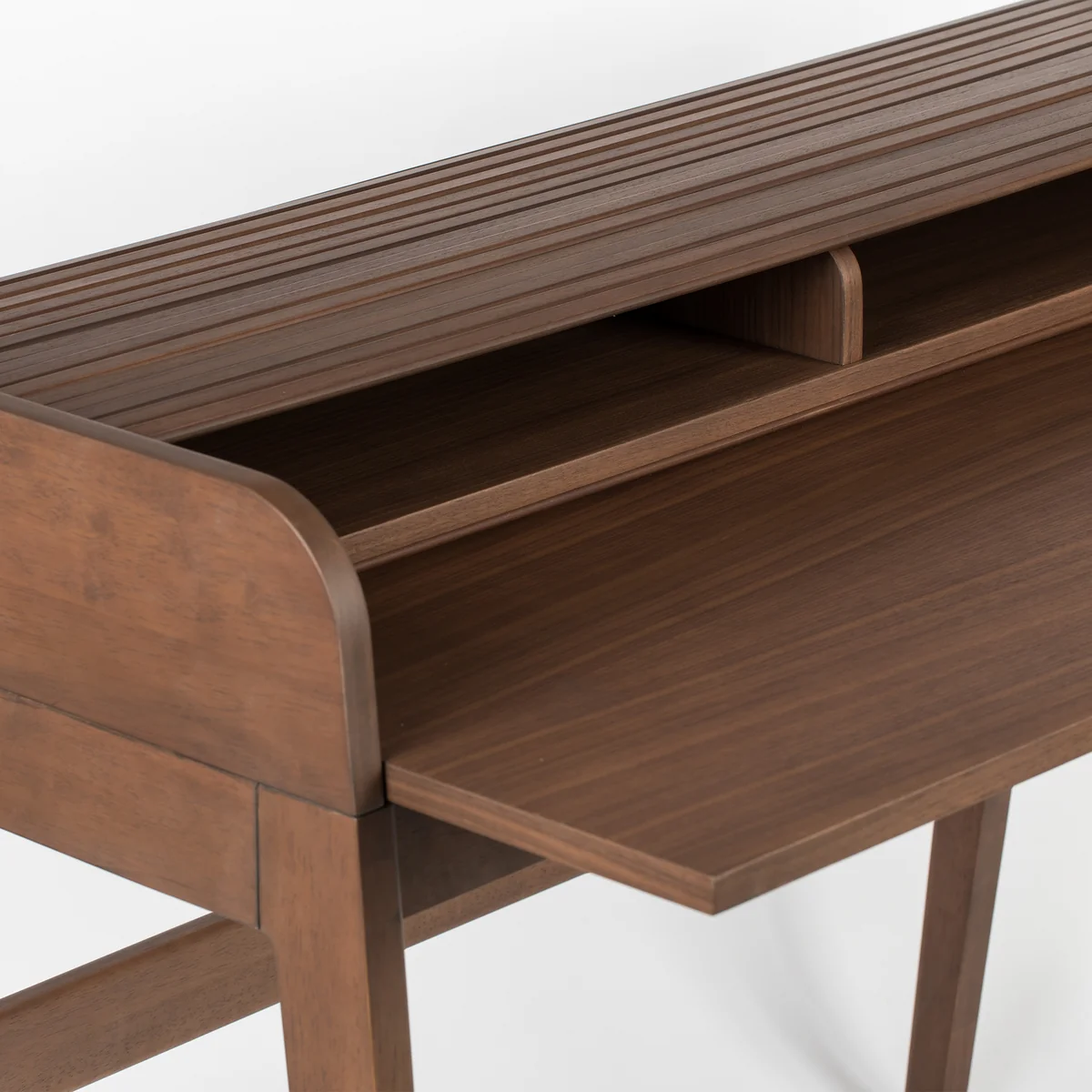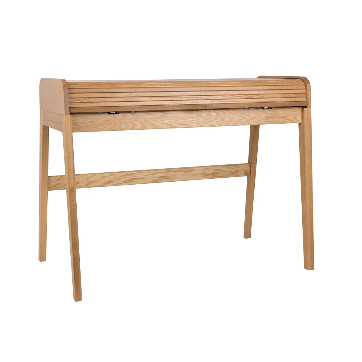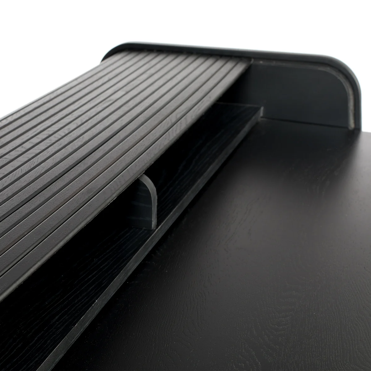 Gefertigt aus hochwertigem Echtholzfurnier mit sanft gerundeten Kanten und filigranen, konisch zulaufenden Beinen, verleiht der Barbier Schreibtisch jedem Raum eine warme, einladende Note. Das besondere Designmerkmal: eine verschiebbare Abdeckung mit feinen Rillen, die ein großzügiges Innenfach für Kabel, Notizbücher, Tablets oder andere Arbeitsutensilien verbirgt. So bleibt die Tischfläche stets aufgeräumt – ideal für fokussiertes Arbeiten.