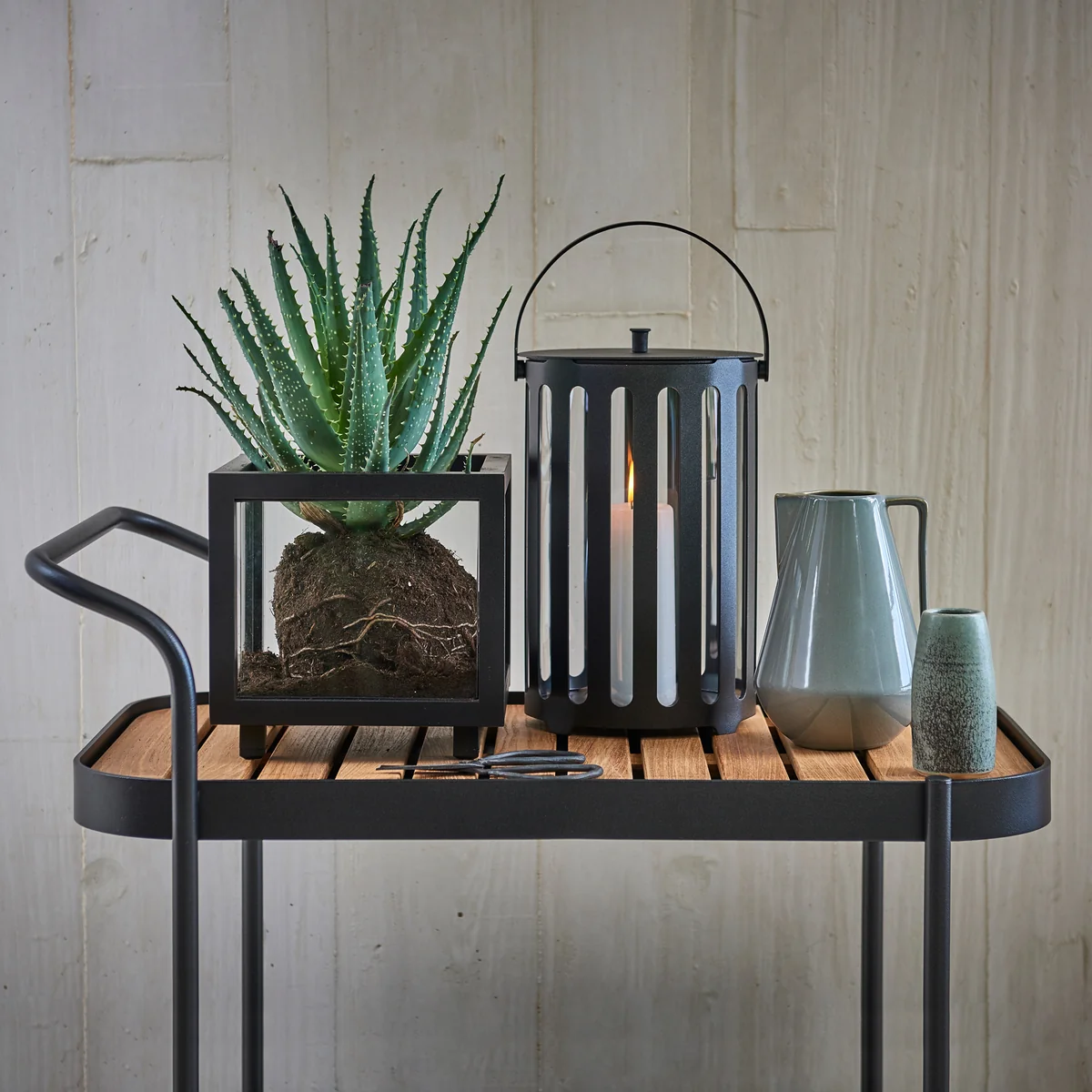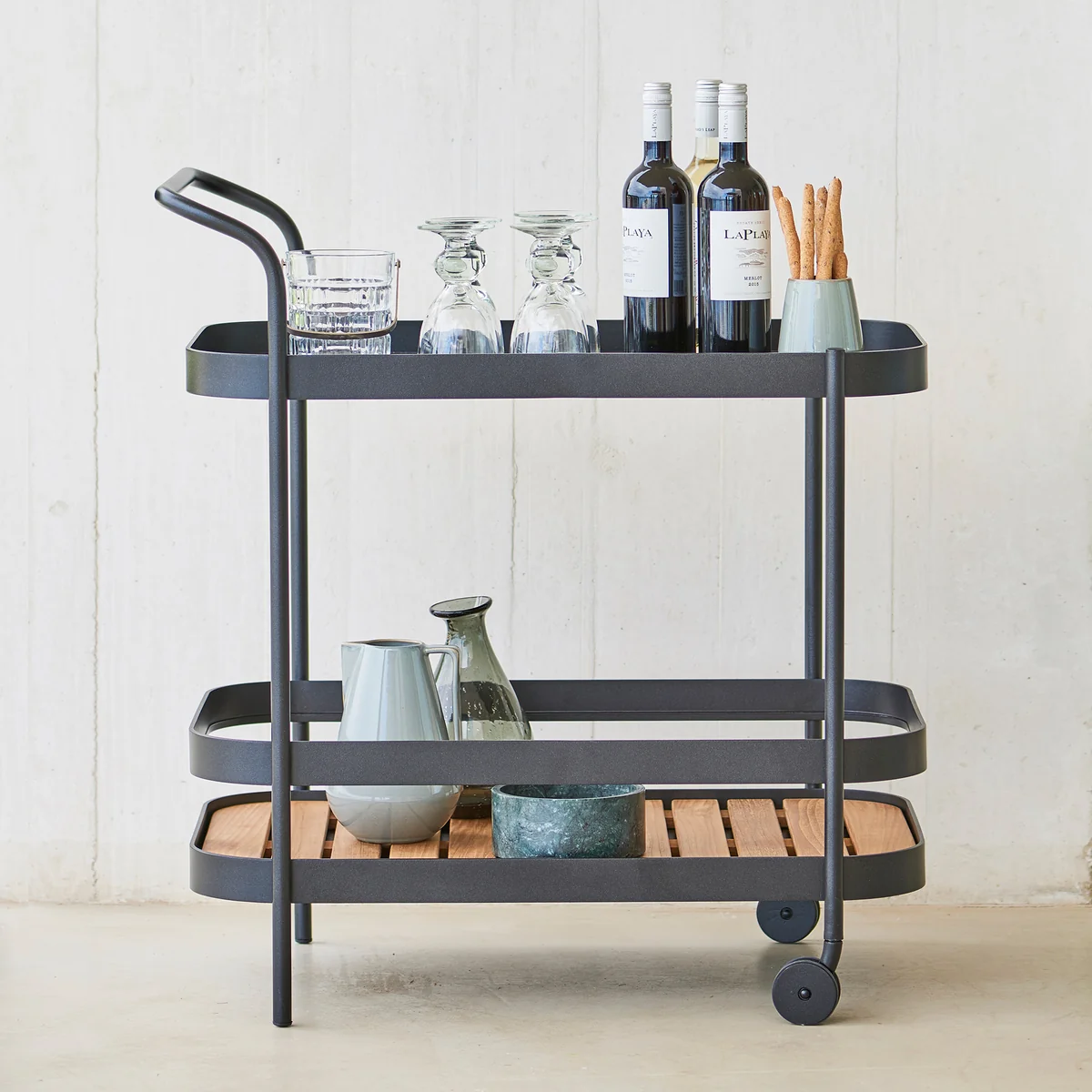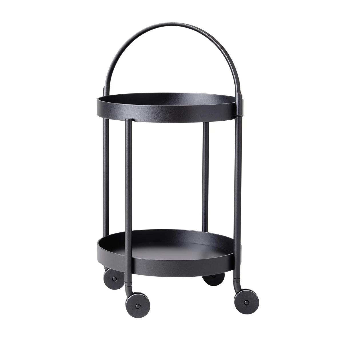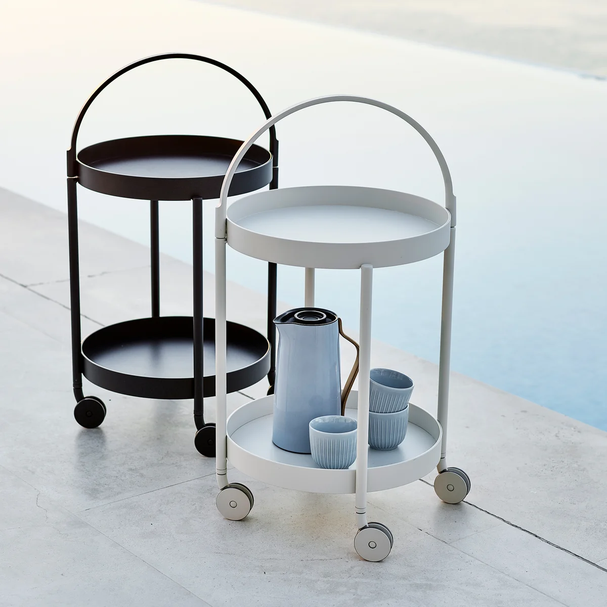 Roll wird aus beschichtetem Aluminium hergestellt. Dadurch wird der Trolley witterungsbeständig und langlebig. Er ist zudem in verschiedenen Größen und zeitlosen Farben erhältlich. Die kleine Version mit zwei Ablageflächen, vier Rollen, einem Tragegriff und einem Durchmesser von 44 cm eignet sich bestens als flexibler Beistelltisch auf dem Balkon oder auch im Wohnzimmer. Auf ihm finden Erfrischungen, Gläser, Bücher, die Sonnenbrille und Co. einen schönen Platz. Die obere Ablagefläche lässt sich abnehmen und als eigenständiges Tablett mit Griff einsetzen.