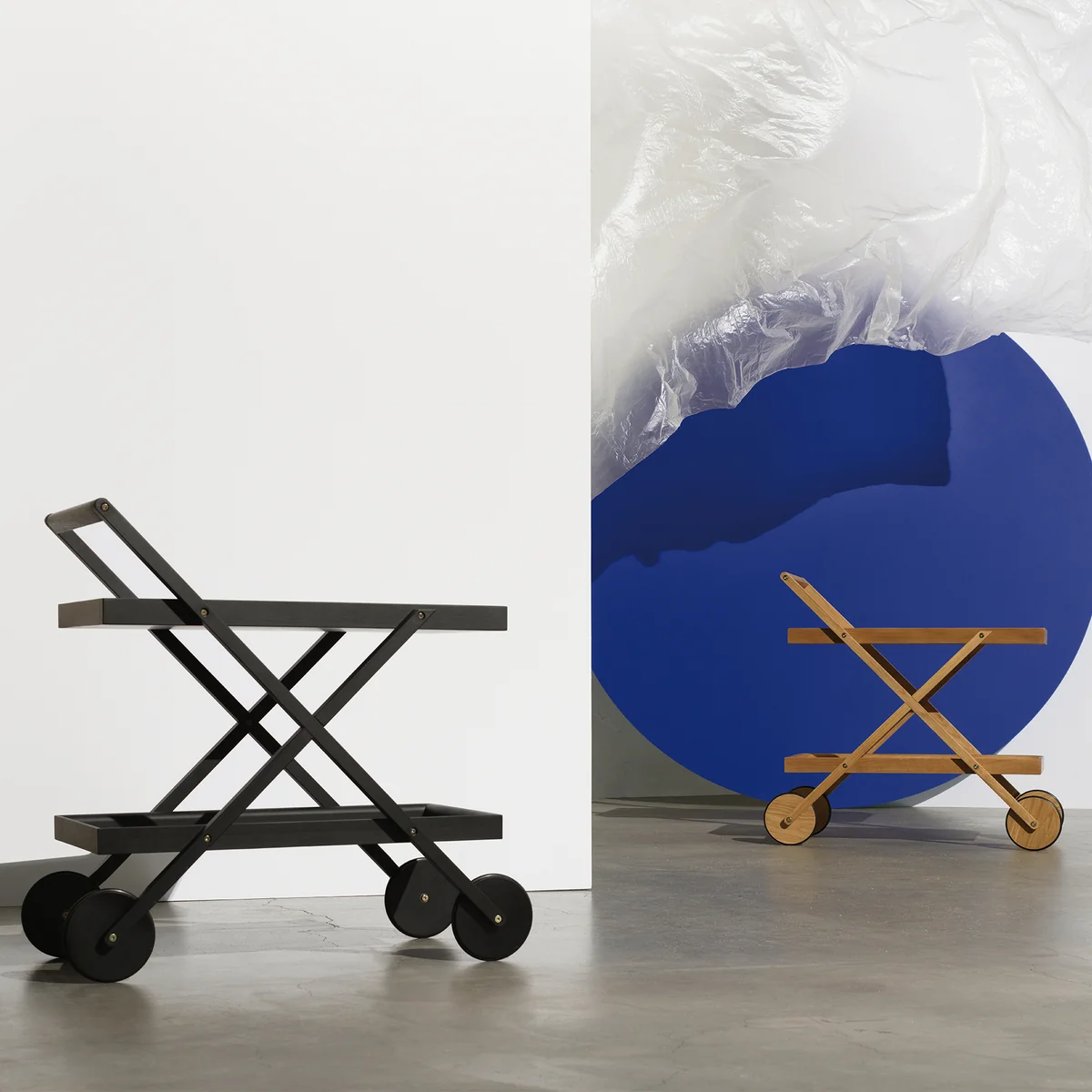 Gunilla Allard ist eine der renommiertesten Möbeldesignerinnen Schwedens. Während sie normalerweise mit Metall arbeitet, hat sie es geschafft, den Exit Trolley mit einer ähnlich grafischen Präzision in fein verarbeitetem Eichenholz zu schaffen. „Es ist eine Herausforderung für mich, mit Holz zu arbeiten. Sie würden denken, Sie müssten etwas dickere Abmessungen wählen, aber der Servierwagen ist so filigran wie möglich. Das natürlich aussehende Holz vermittelt eine weichere Note für ein gemütlicheres Gefühl, das für private und öffentliche Umgebungen gleichermaßen geeignet ist.“