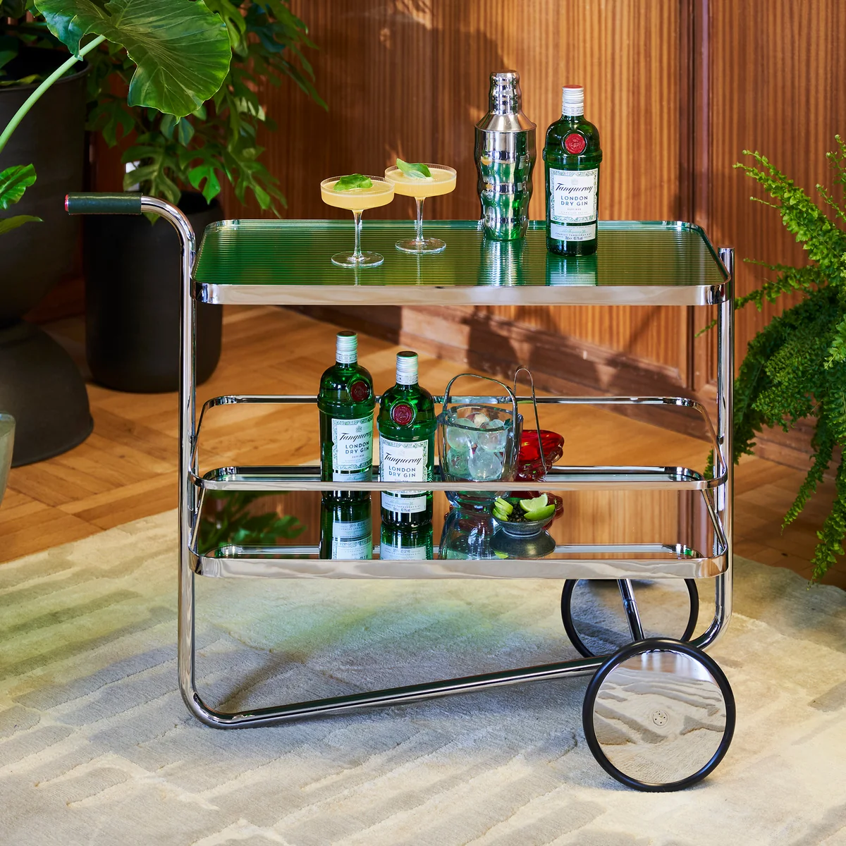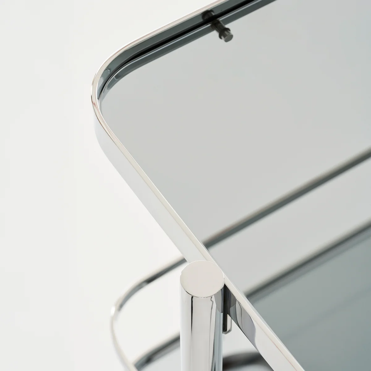 Zwei Einlegeböden aus getöntem Klarglas bieten großzügigen Platz für Gläser, Flaschen und Barzubehör, eignen sich aber ebenso für Bücher oder dekorative Objekte. Die Glasflächen werden von einem Rahmen aus verchromtem Flachstahl gehalten, während eine von Thonet ergänzte Reling auf der unteren Ebene für zusätzliche Sicherheit sorgt. Im Zuge der Neuauflage wurde der Servierwagen leicht vergrößert, um heutigen Wohn- und Nutzungsanforderungen gerecht zu werden – ohne den ikonischen Charakter des Originals zu verlieren.
