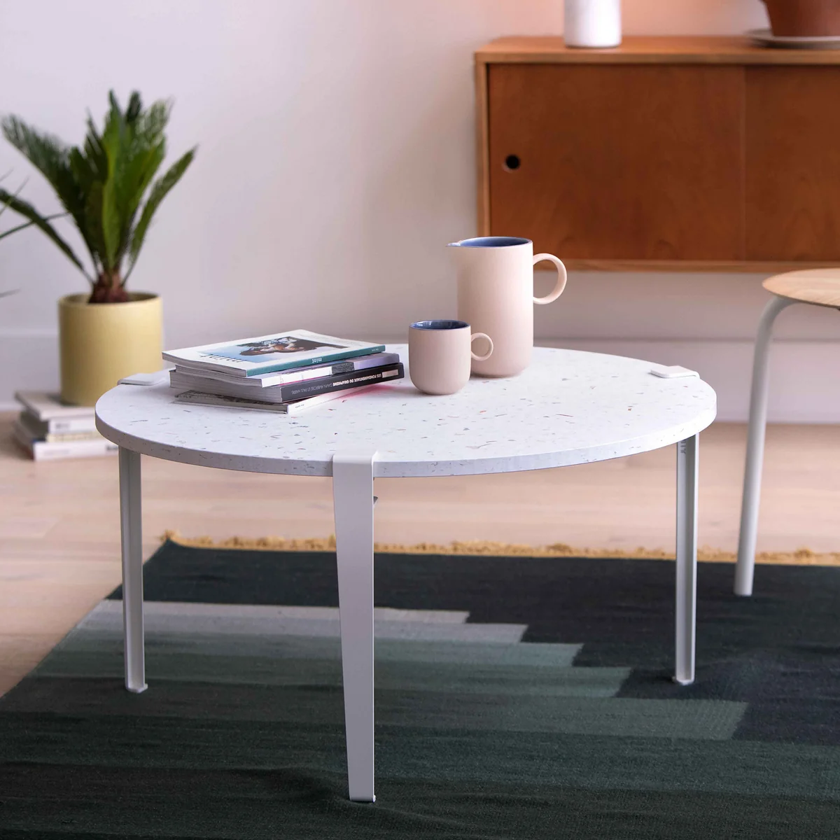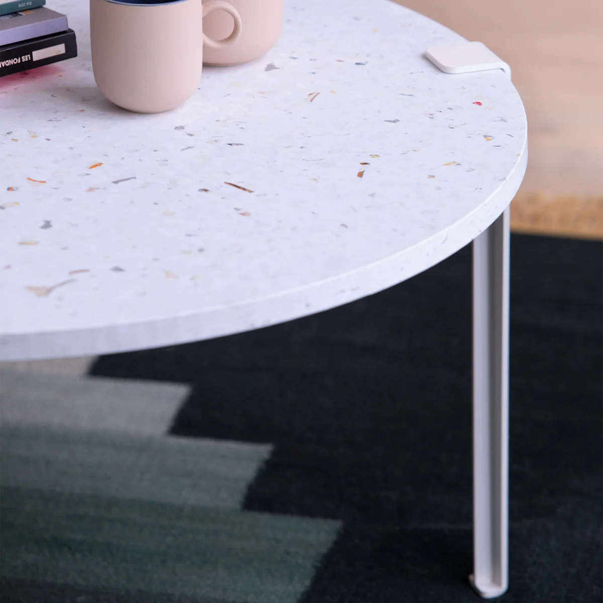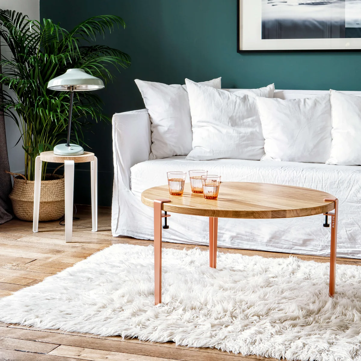 Das Couchtisch- und Bankbein besteht je nach Wahl aus pulverbeschichtetem oder patiniertem Stahl und ist in vielen verschiedenen Farben erhältlich.