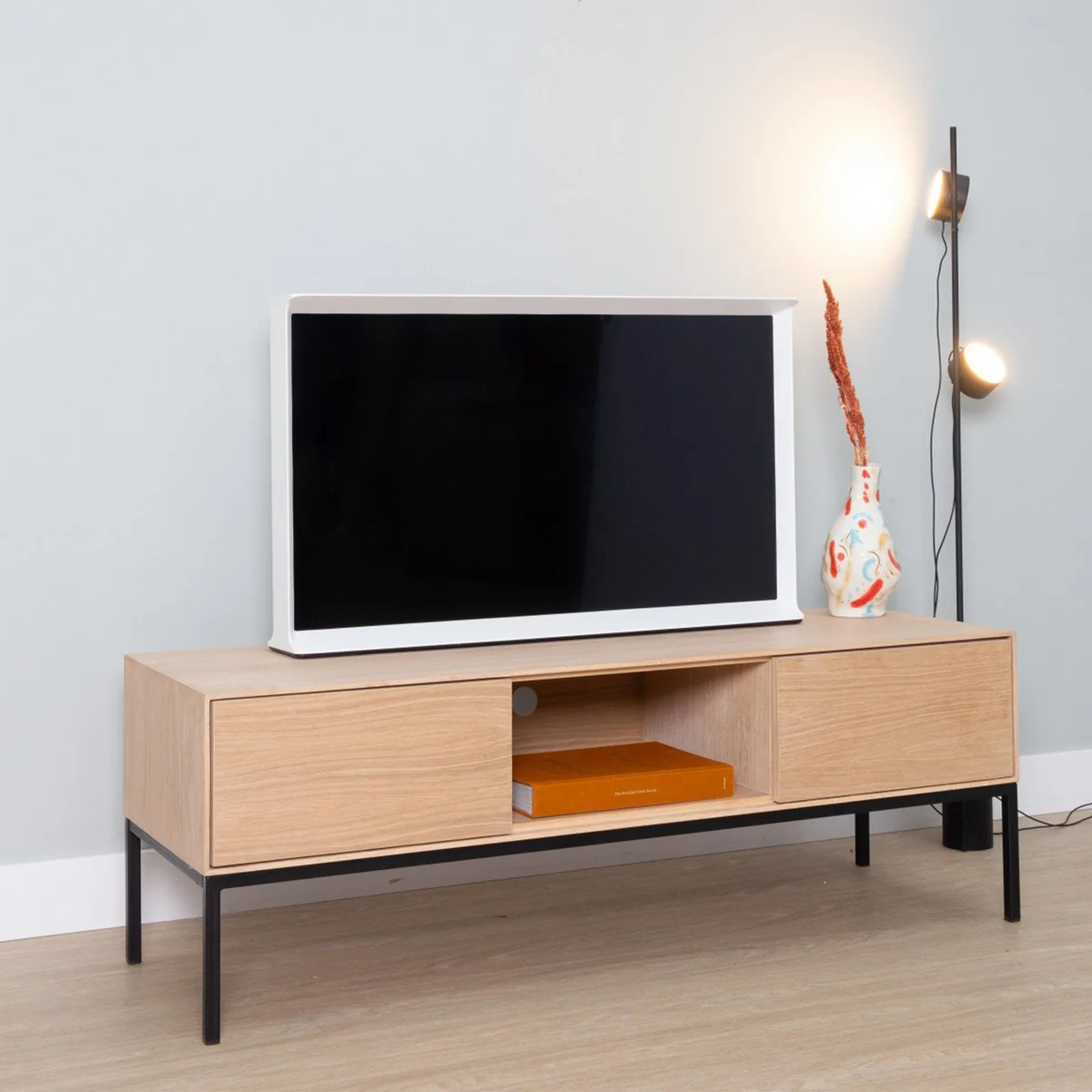 Für das Nuury TV Möbel kombiniert Nuuck naturfarbenes Eichenholz mit schwarzem Stahl in einem zeitlosen Design. Der Fernsehschrank eignet sich wunderbar für den Fernseher im Wohnzimmer. Hinter zwei Türen bietet bietet Nuury zusätzlichen Stauraum für allerlei Kleinigkeiten, die nicht direkt auf den ersten Blick zu sehen sein sollen. Das mittlere Fach ist offen und eignet sich unter anderem für eine Spielekonsole.