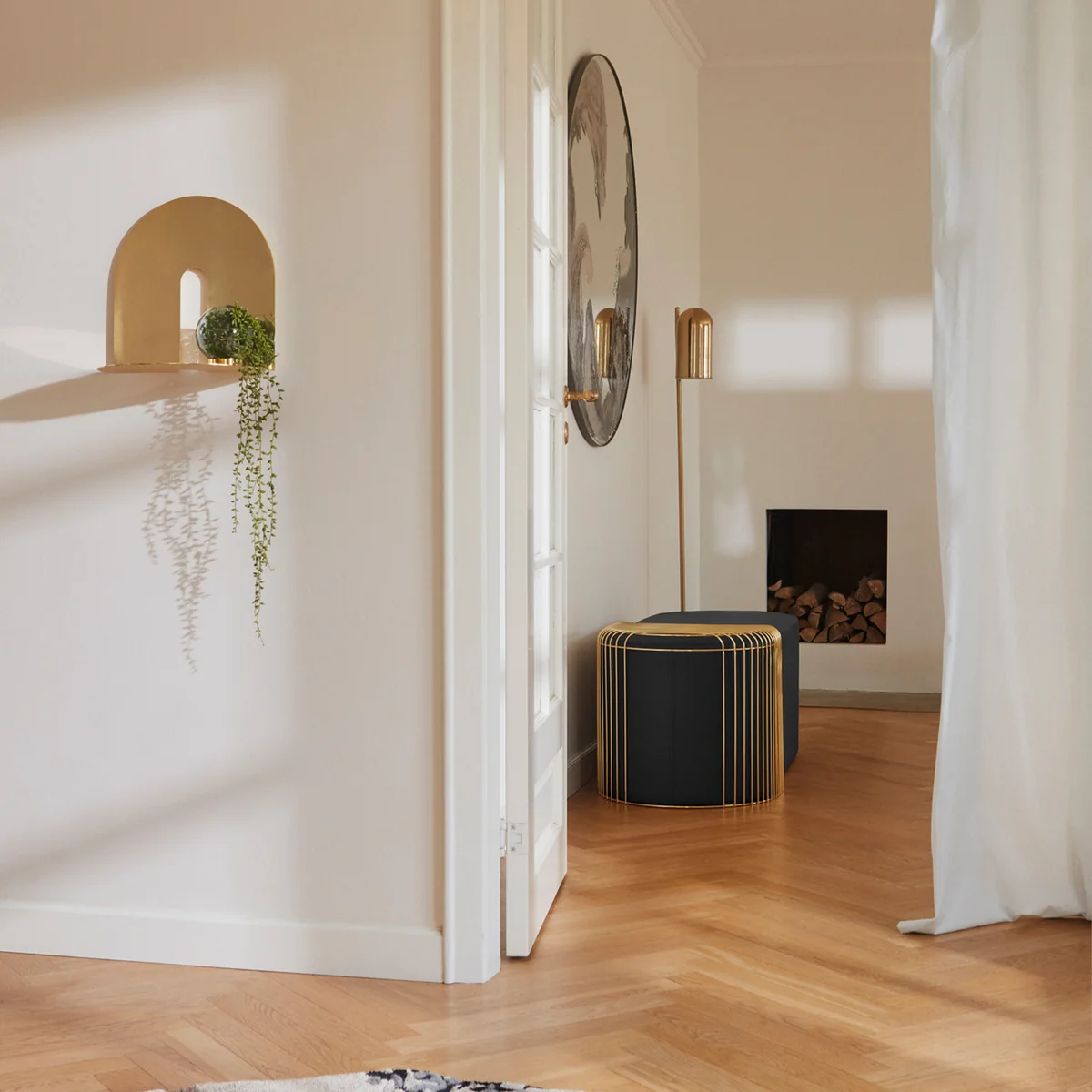 Das Regal ist auch in einem matten Schwarz erhältlich, das einen ästhetisch angenehmen Kontrast zum goldenen Glanz bildet. Es kann neben dem Bett als Nachttischablage oder im Flur als Regal für Deko-Objekte eingesetzt werden.