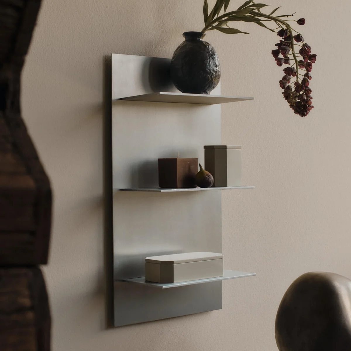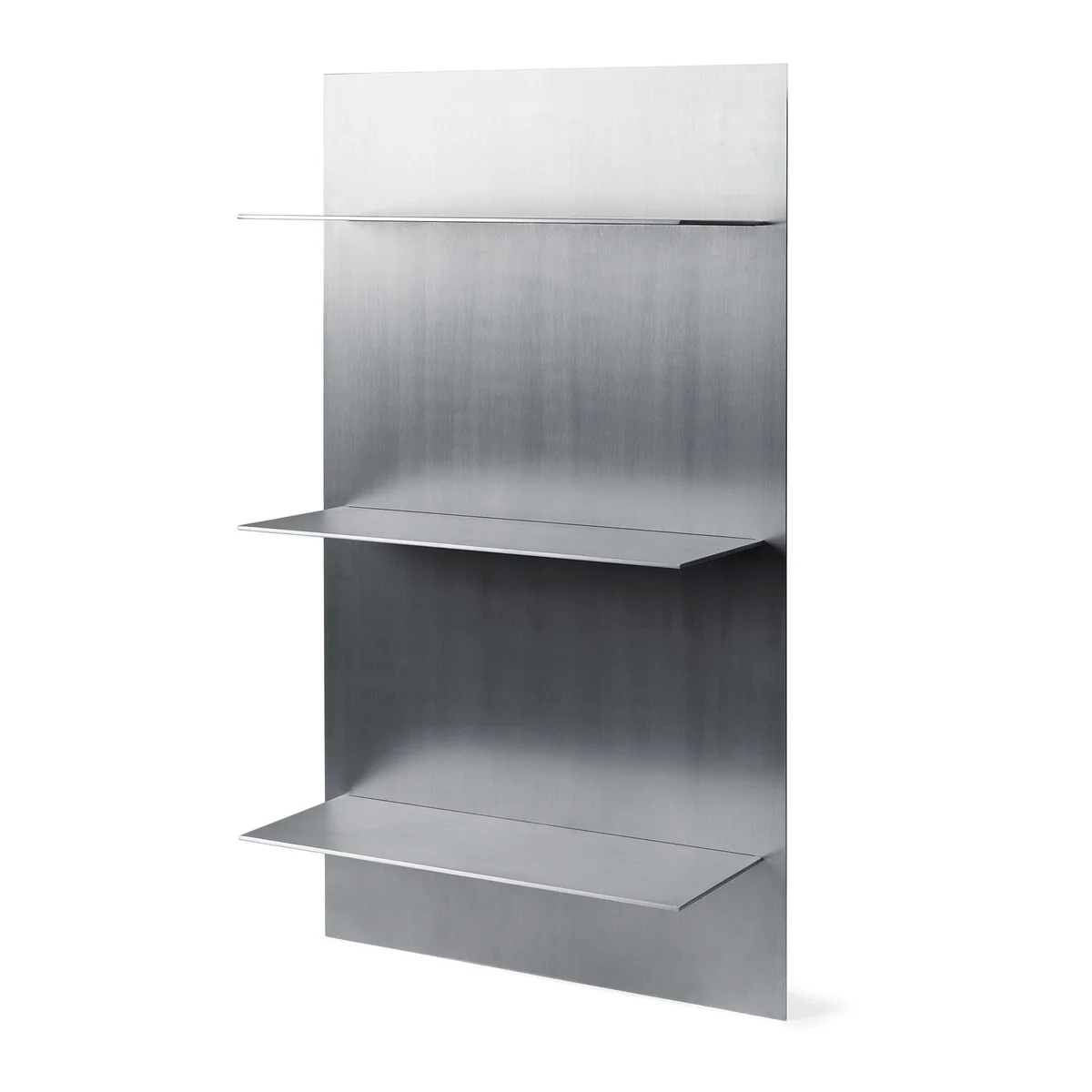 Das Lager Triple Wandregal von Ferm Living ist aus Aluminium gefertigt und greift industrielle und brutalistische Ästhetik auf. Es bietet schlanken, funktionalen Stauraum für jeden Raum. Das Design ermöglicht eine einfache Wandmontage mithilfe eines französischen Aufhängesystems, und der gleichmäßige Abstand zwischen den Abschnitten ermöglicht das Stapeln mehrerer Regale, perfekt für eine zusammenhängende und hohe Bibliotheksausstellung.