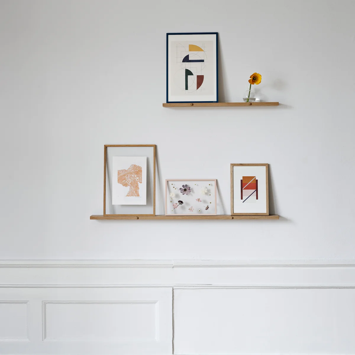 Das Gallery Shelf von Moebe überzeugt mit seiner Simplizität. Gefertigt aus massiver Eiche bietet das Wandregal dank seiner vorderen Rille ausreichend Platz für Bilderrahmen und Poster. Die freie, glatte Fläche im hinteren Bereich des Regals kann wunderbar für Bücher, Vasen und sonstige Deko-Elemente genutzt werden. Das Gallery Shelf kann einzeln oder in Kombination mit weiteren Wandornamenten arrangiert werden, um so - wie der Name auch schon vermuten lässt - eine Galeriewand aus Fotos und Postern im Wohn- oder Kinderzimmer entstehen zu lassen.