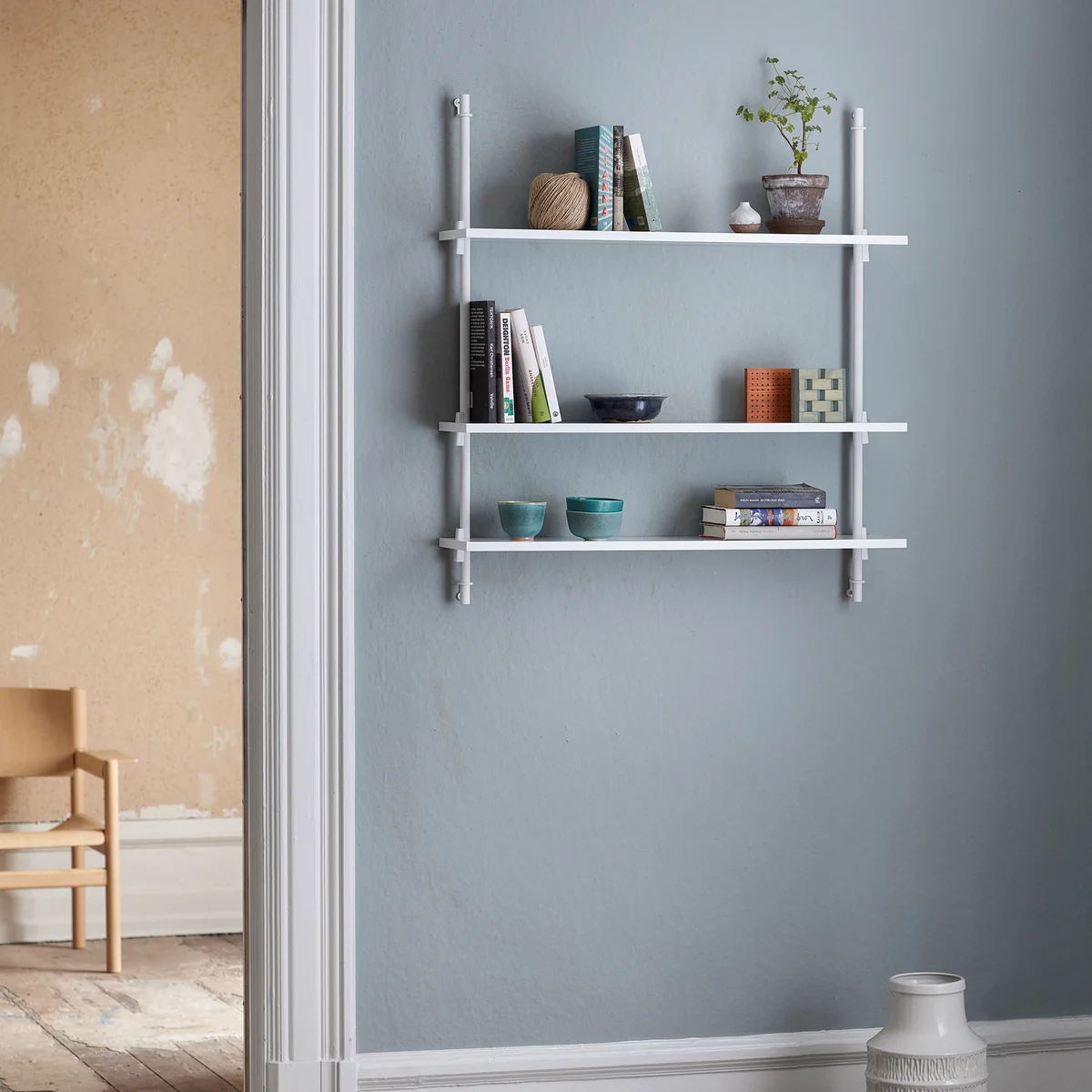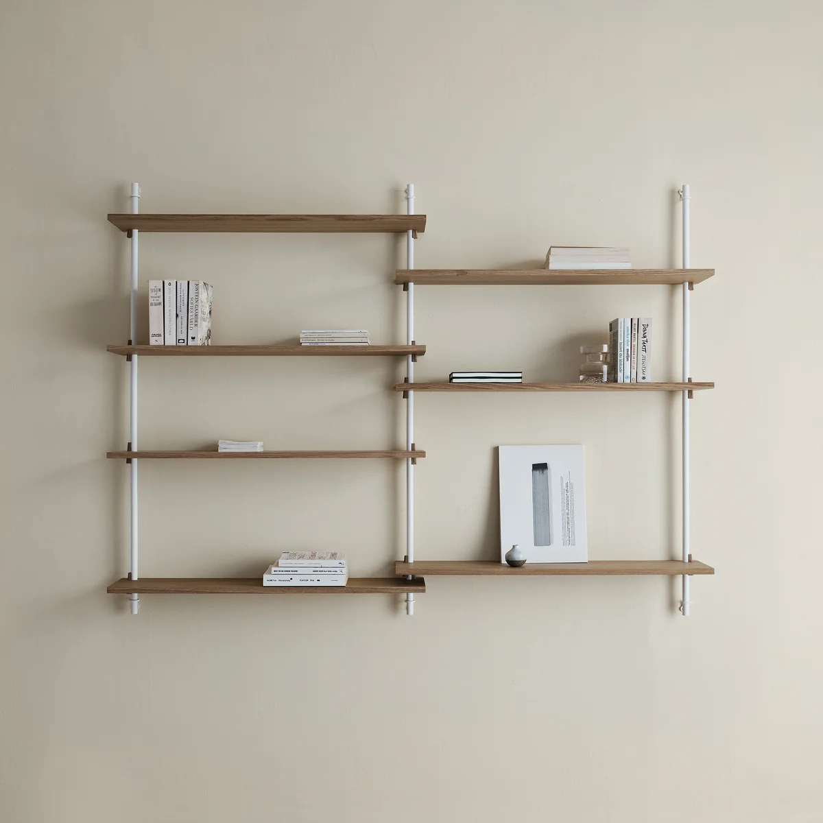 Das Wandregalsystem von Moebe zeichnet sich durch die multifunktionalen und anpassungsfähigen Eigenschaften aus. Das modulare System kann nach Wunsch in die Höhe oder in die Breite gehen und füllt somit jede Wand, egal ob im Flur oder im Wohnzimmer.
