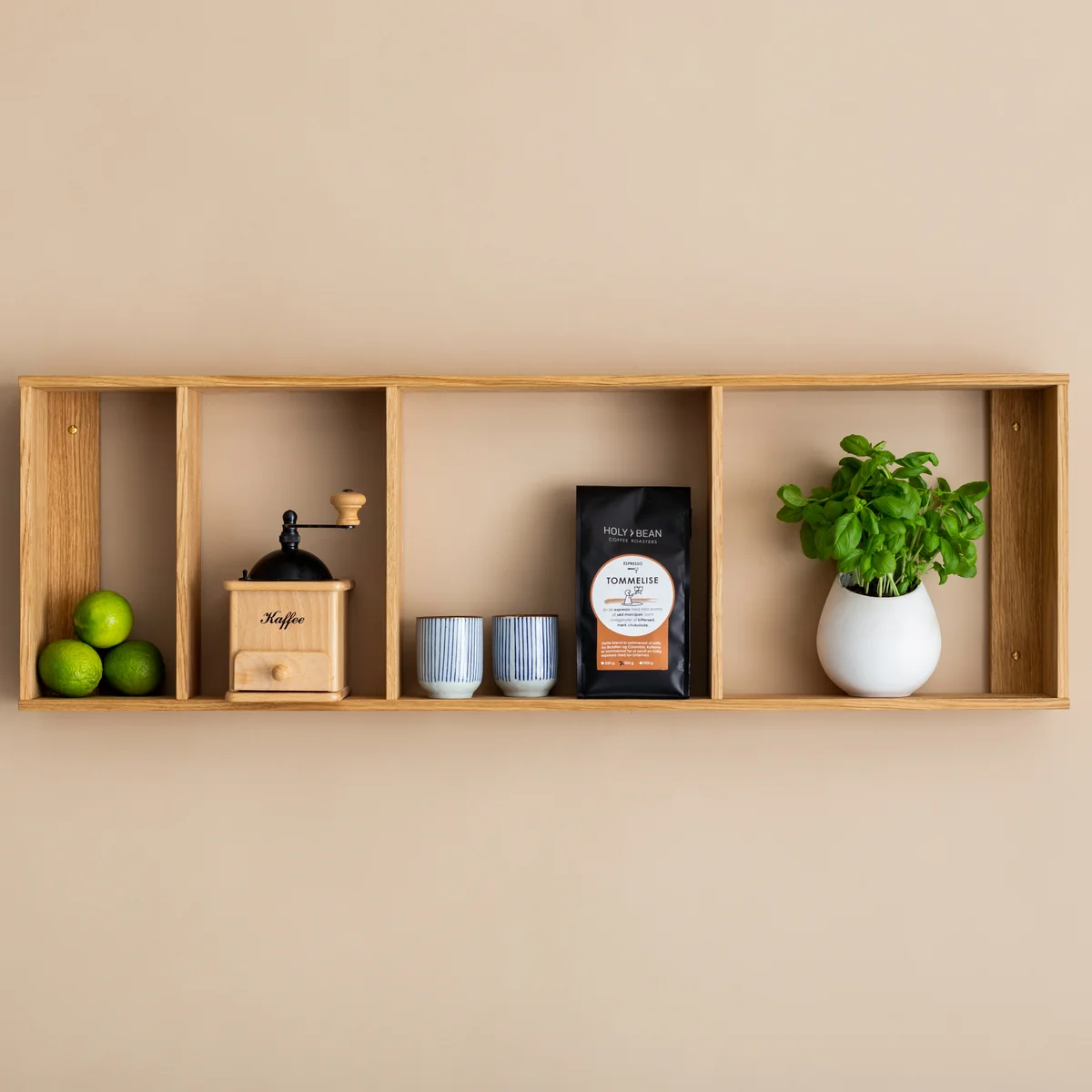 Das Foursquare Wandregal von We Do Wood ist ein kompaktes und schlankes Wandregal, das durch sein minimalistisches und schlichtes Design optimal fürs Verstauen, aber auch für das Präsentieren von Gegenständen geeignet ist. Dazu zählen Weinflaschen, Parfüm, Bücher oder Dekogegenstände- der Fantasie sind keine Grenzen gesetzt, egal in welchem Raum!