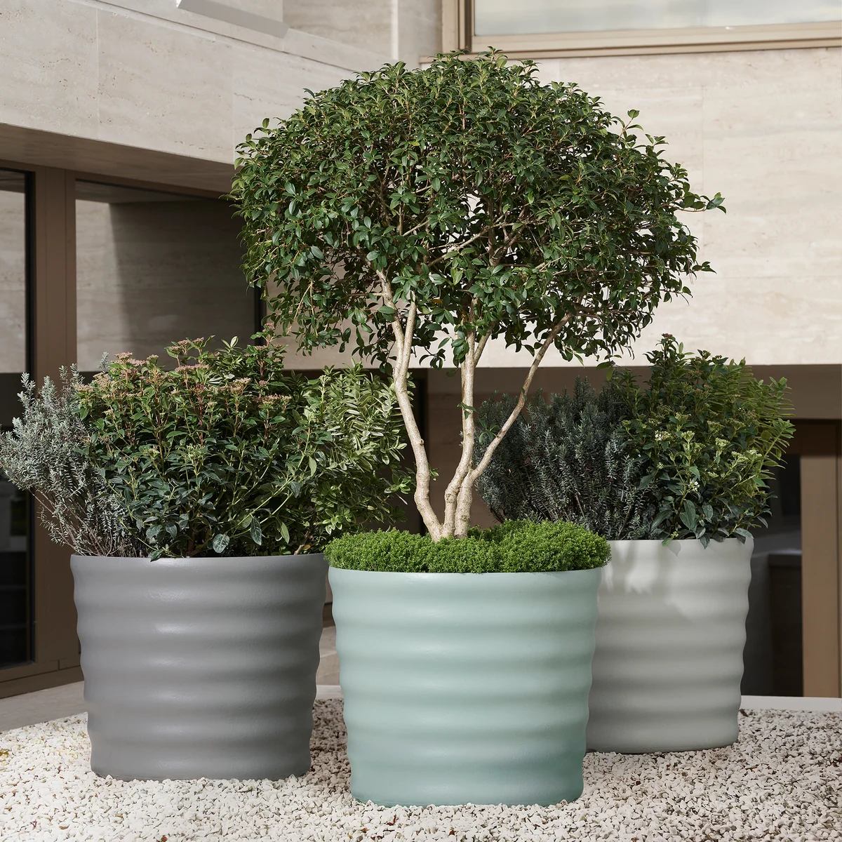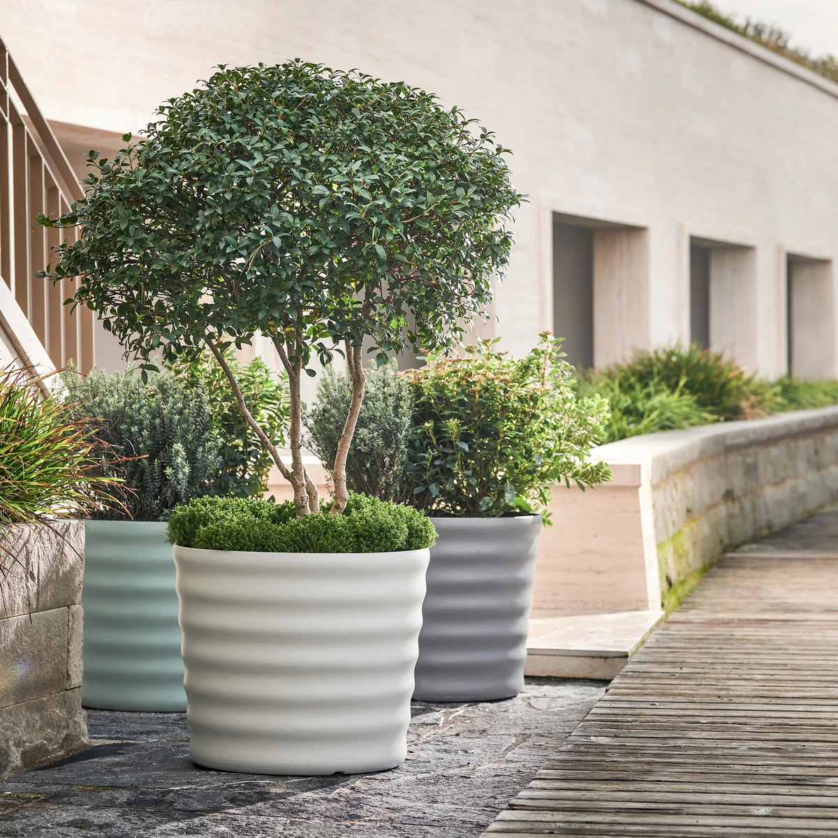 Anders als die gewöhnlichen Designs der Marke Eternit mit glatter Oberfläche, besticht das Maia Pflanzgefäß durch eine leicht gewellte und verspielte Außenseite. Maia steht durch die dezente natürliche Färbung bewusst im Hintergrund und lenkt somit den Fokus automatisch auf die farbenfrohen Pflanzen auf dem Balkon, der Terrasse oder im Garten.
