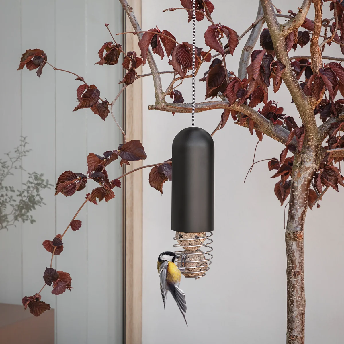 Der Meisenknödelhalter des Labels Eva Solo ermöglicht überaus leichten und optimalen Zugang für allerlei gefiedert Freunde! Das hängende Vogelfutterhaus kann bis zu drei Meisenknödel fassen. Der Futterhalter verhindert, dass große Vögel den Kleinen die Leckereien wegschnappen. Zum Nachfüllen von Futter muss lediglich der schwarze Deckel angehoben werden. Der Meisenknödelhalter lässt sich simpel mit einer Schnur an einem Baum oder einer Dachrinne eines Fensters befestigt werden. Er wird aus einem Materialmix aus Polyester, pulverbeschichtetem, rostfreien Stahl gefertigt.