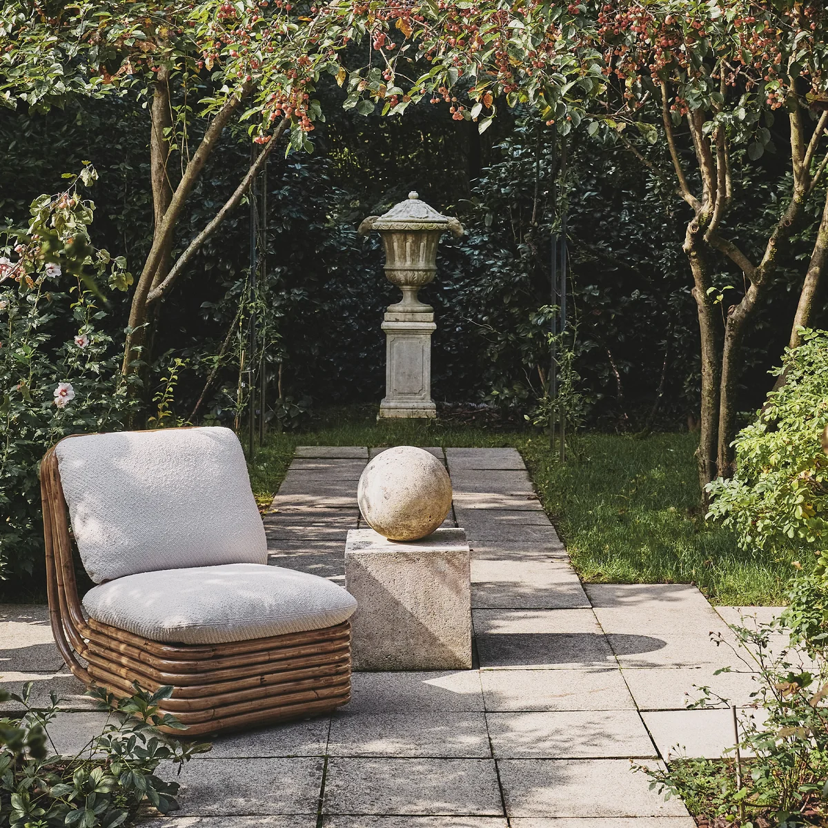 Der Bohemian 72 Outdoor Lounge Stuhl des dänischen Herstellers Gubi begeistert mit seinen natürlichen Materialien. Er wird aus Rattan gefertigt und kann wunderbar sowohl im Indoor- als auch im Outdoor-Bereich platziert und genutzt werden. Die Sitz- und Rückpolsterung wird aus exklusivem Cheveron Chenille Stoff des luxuriösen Herstellers Dedar hergestellt.