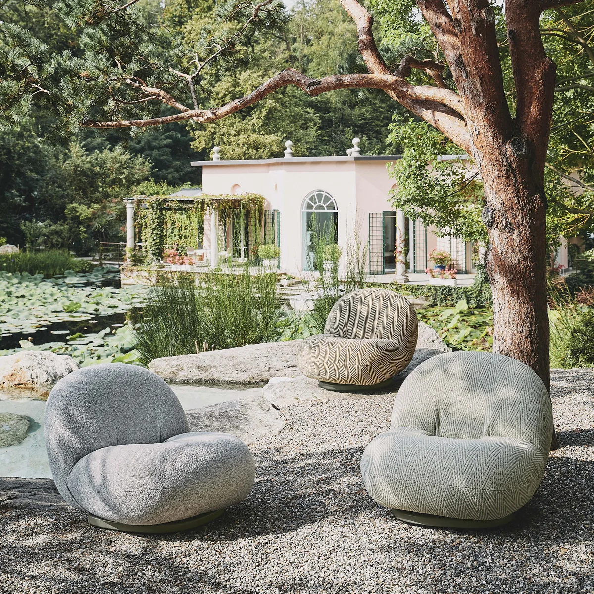 Der Pacha Outdoor Lounge Chair des dänischen Herstellers Gubi passt sich dank seiner abgerundeten Form harmonisch an den Körper an. Der moderne Sessel mit Tellerfuß wird mit Dedar Belsuede bezogen. Der Bezugstoff besteht aus 100% Polypropylen. Der Pacha Lounge Chair kann ganz nach Ihren Belieben im Indoor- oder Outdoor-Bereich genutzt werden.