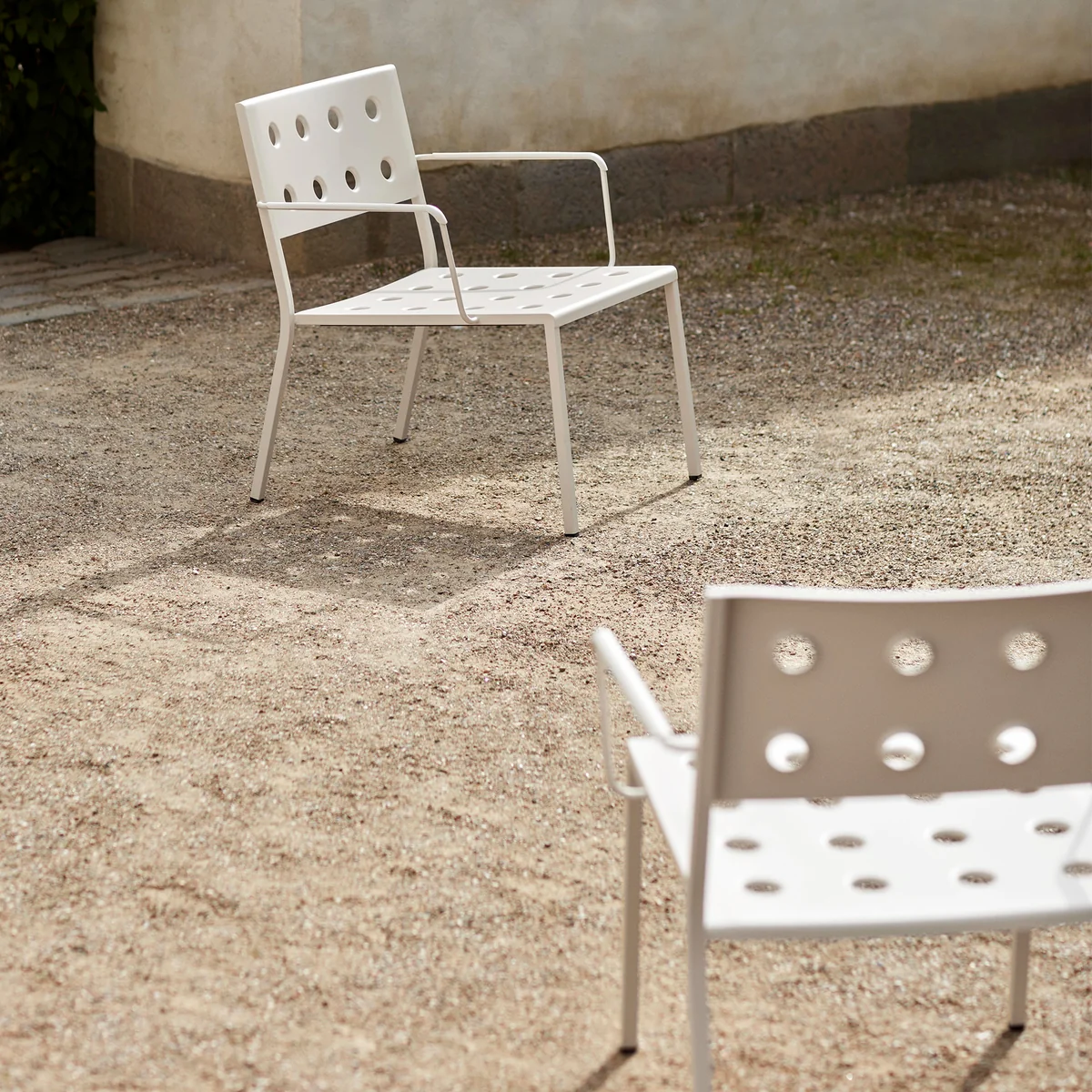 Der Balcony Lounge Armlehnstuhl von Ronan und Erwan Bouroullec für HAY ist ein eleganter und funktionaler Stuhl mit Armlehnen. Das breite, quadratische Design erhält durch die abgerundete Rücken- und Armlehne einen softeren Look. Die Löcher in der Sitzfläche und der Rückenlehne verleihen der Konstruktion Stabilität und sorgen zudem für einen besonderen Ausdruck. Der Balcony Lounge Armlehnstuhl besteht aus pulverbeschichtetem Stahl mit einer Beschichtung, welche Widerstandsfähigkeit und Haltbarkeit garantieren, wodurch er auch optimal für den Außenbereich geeignet ist.