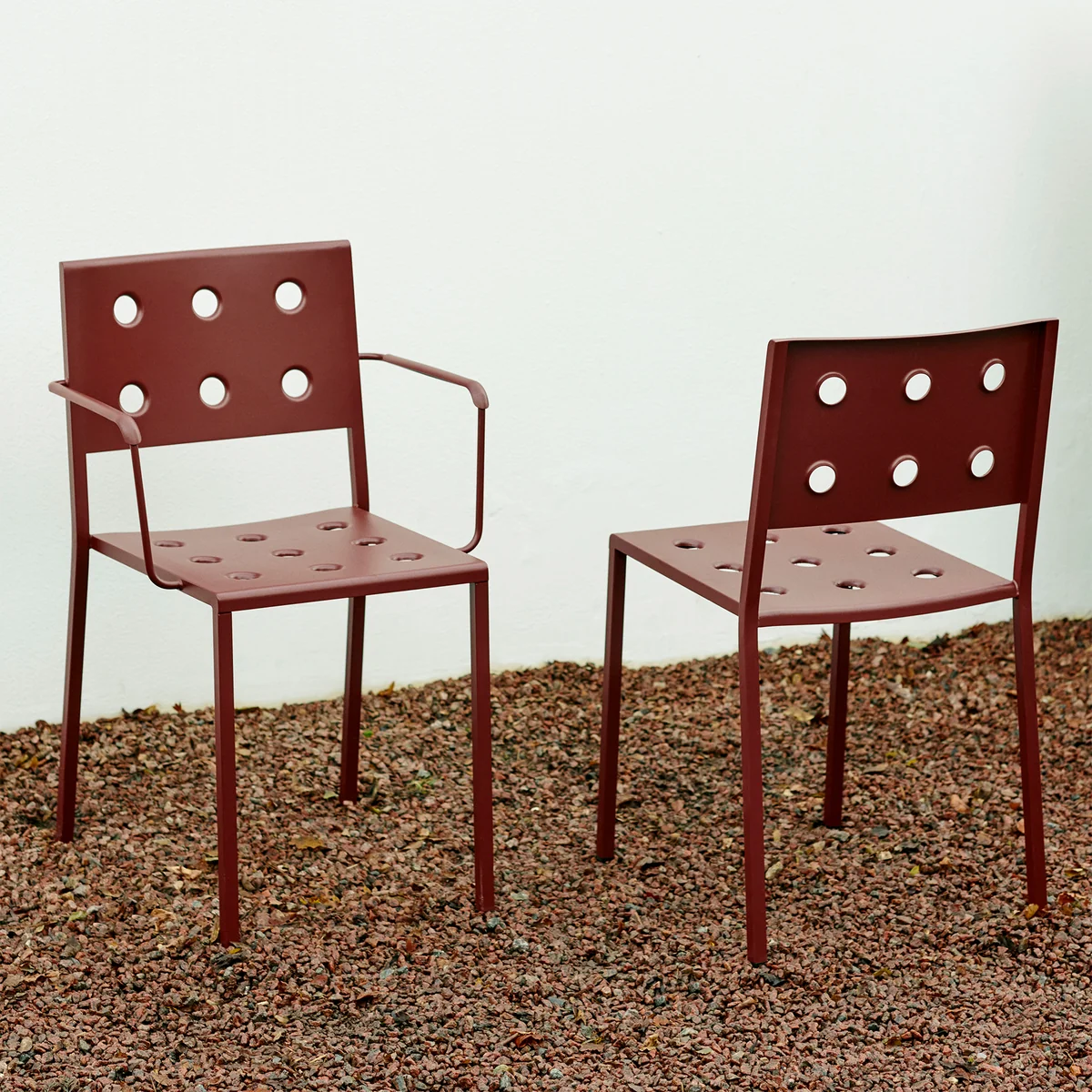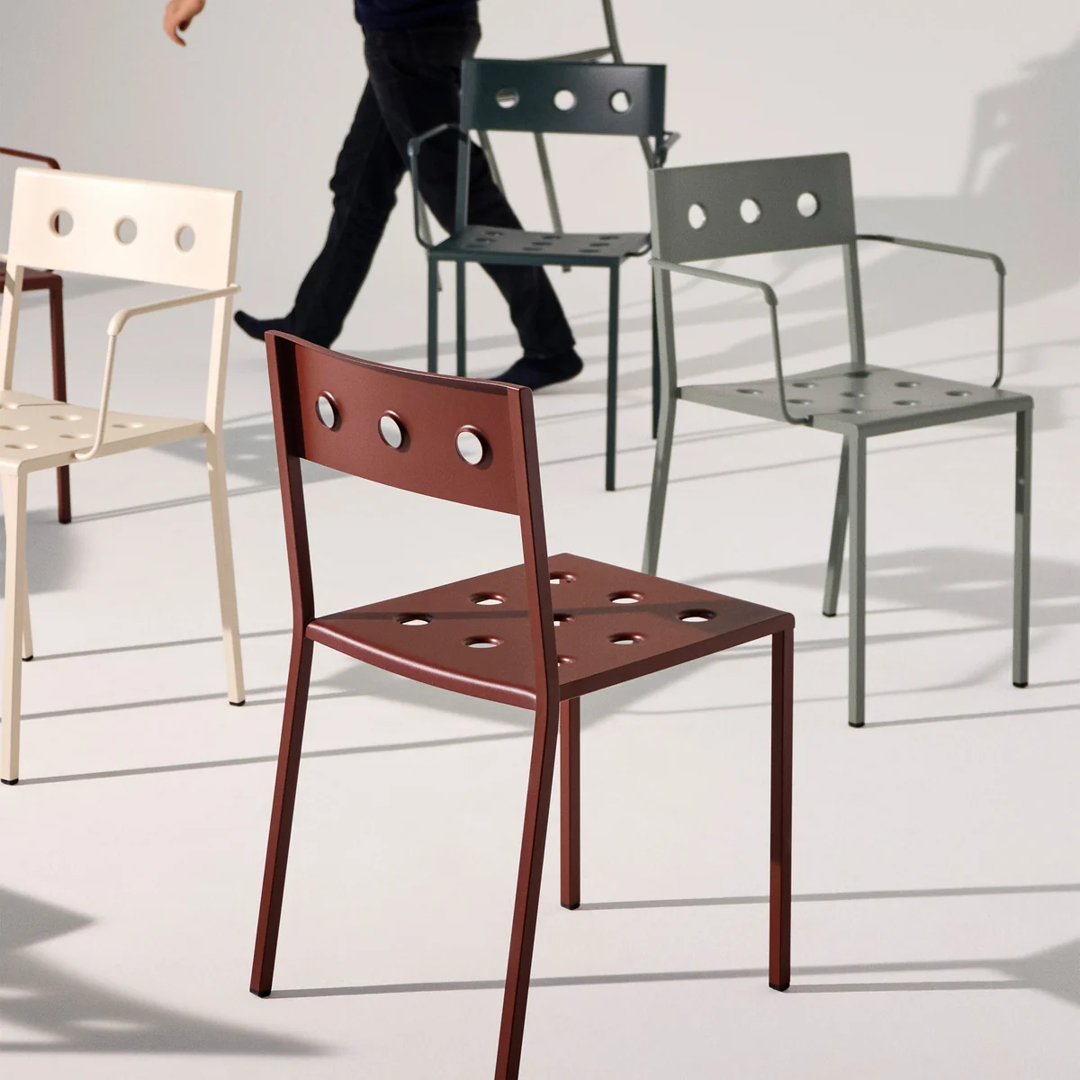 Der Balcony Stuhl von Ronan und Erwan Bouroullec für HAY ist ein eleganter und funktionaler Esszimmerstuhl für den Außenbereich. Das breite, quadratische Design erhält durch die abgerundete Sitzfläche und Rückenlehne einen softeren Look. Die Löcher in der Sitzfläche und der Rückenlehne verleihen der Konstruktion Stabilität und sorgen zudem für einen besonderen Ausdruck. Der Balcony Stuhl besteht aus pulverbeschichtetem Stahl mit einer Beschichtung, welche Widerstandsfähigkeit und Haltbarkeit garantieren, wodurch er auch optimal für den Außenbereich geeignet ist.