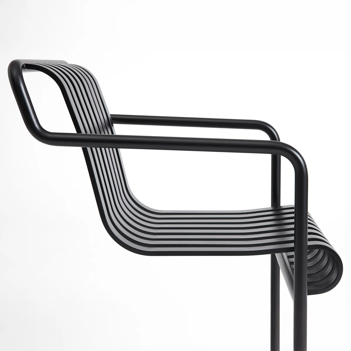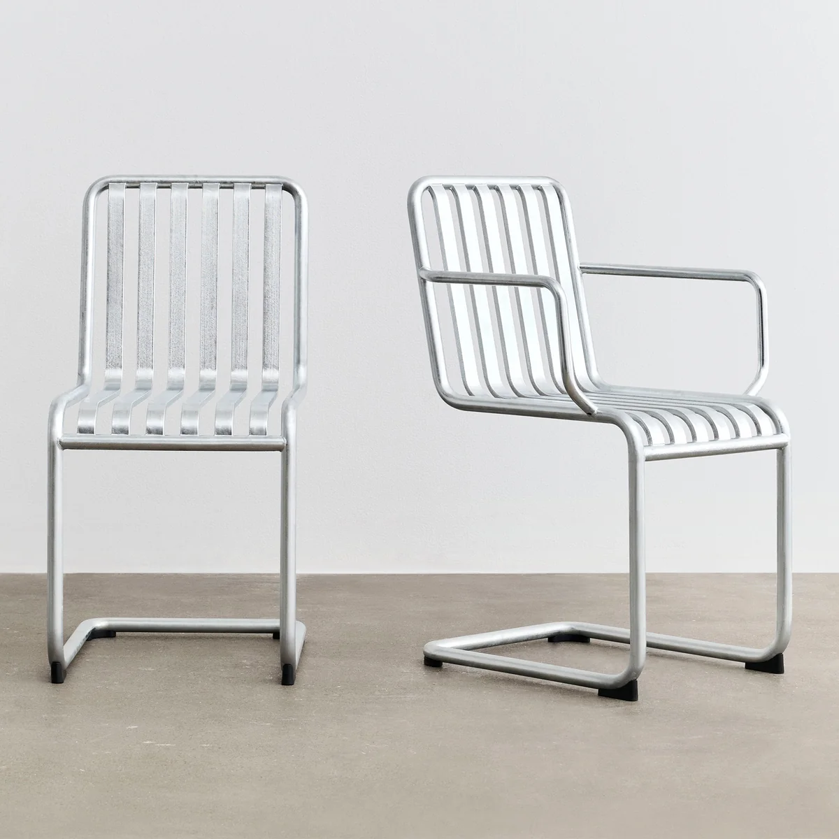 Gefertigt aus pulverbeschichtetem oder feuerverzinktem Stahl, bietet der Armlehnstuhl höchste Wetterbeständigkeit und Robustheit – Eigenschaften, die ihn zu einer langlebigen Wahl für den täglichen Einsatz im Freien machen. Die offene Strebenstruktur verhindert zudem das Ansammeln von Regenwasser und sorgt für eine optimale Luftzirkulation, während gleichzeitig eine moderne, grafische Optik entsteht.