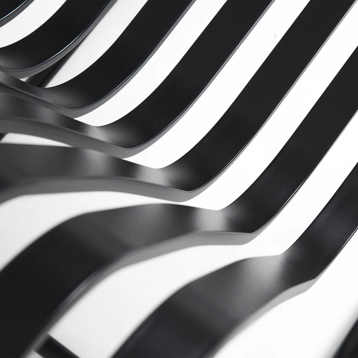 Die Formsprache des Stuhls zeichnet sich durch eine klare, lineare Geometrie aus, bei der gleichmäßig angeordnete Stahlstreben eine luftige, grafische Struktur schaffen, die dem Möbelstück eine visuelle Leichtigkeit verleiht. Diese reduzierte Ästhetik fügt sich mühelos in unterschiedlichste Umgebungen ein – von modernem Outdoor-Living bis hin zu urbanen Begegnungsräumen.