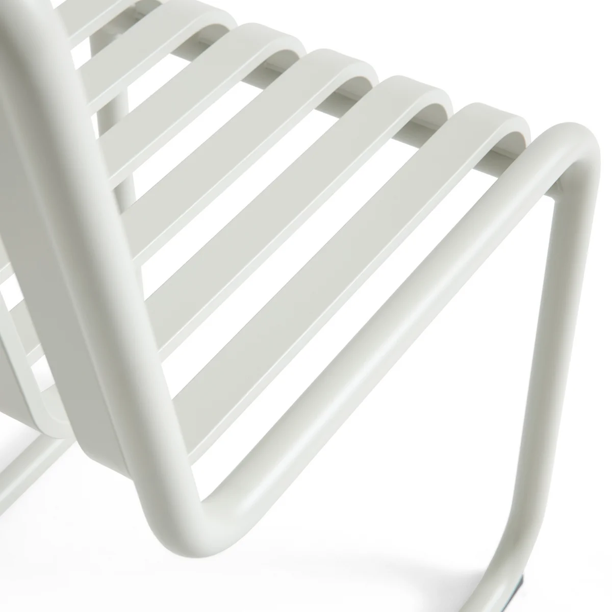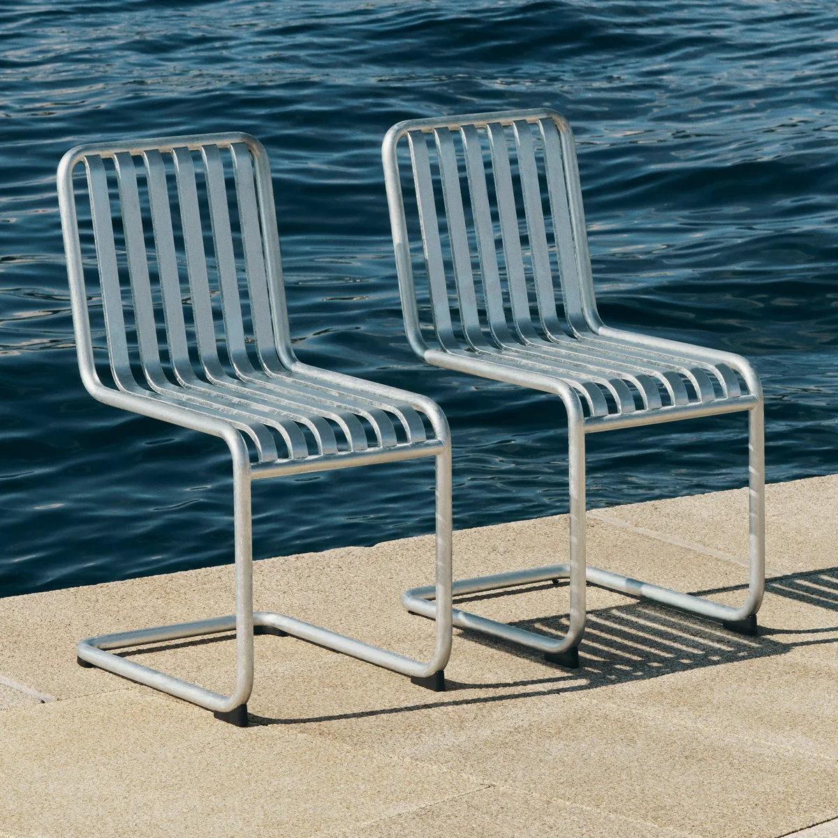 Die Konstruktion aus pulverbeschichtetem oder feuerverzinktem Stahl macht den Palissade Chair besonders wetterbeständig und langlebig. Gleichzeitig sorgt die offene Strebenstruktur dafür, dass Regenwasser ungehindert abfließen kann und der Stuhl auch ohne Kissen komfortabel nutzbar ist.