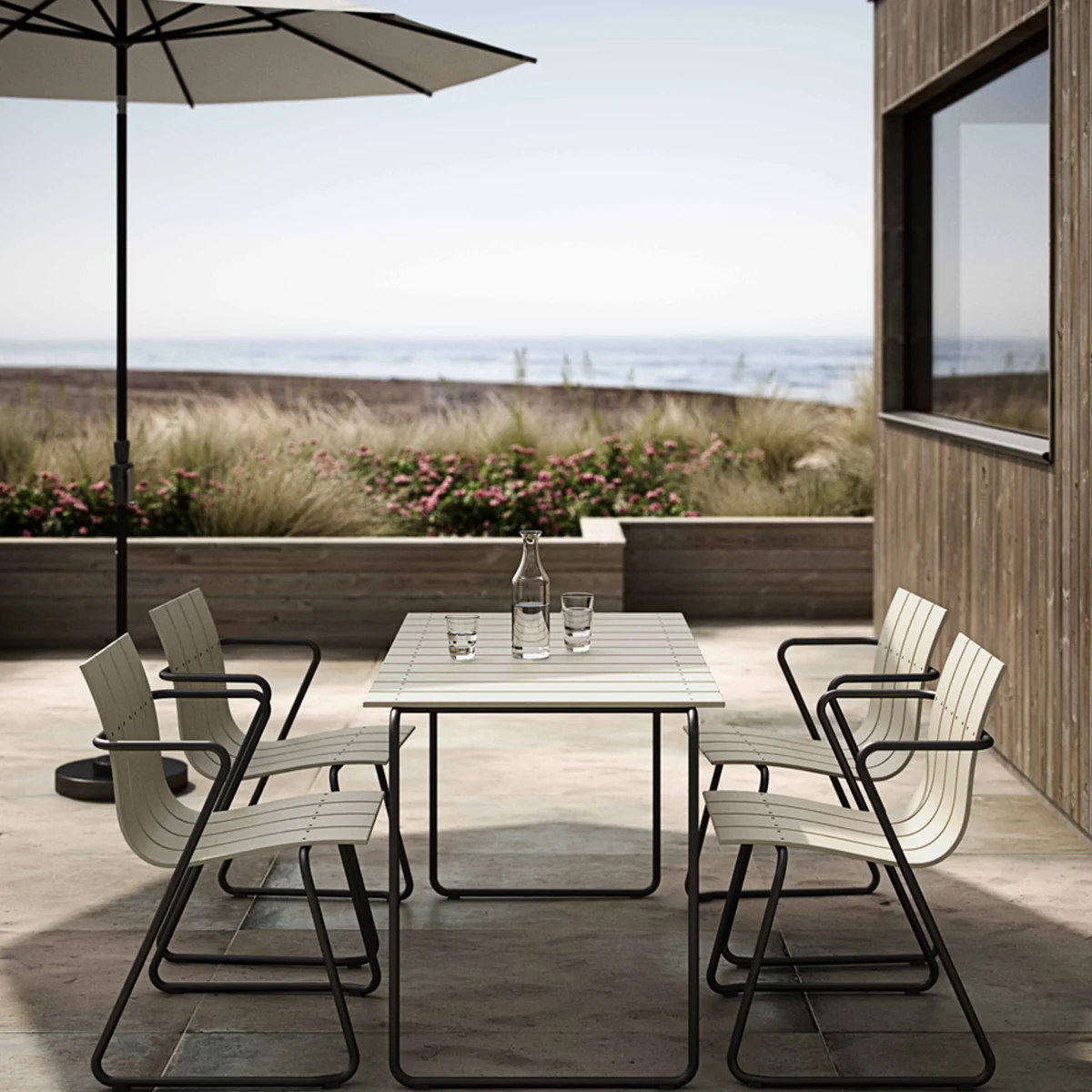 Der Ocean Stuhl von Mater ist ein Entwurf von Nanna Ditzel aus dem Jahr 1955 und wird in der Neuinterpretation in Zusammenarbeit mit dem dänischen Cleantech-Unternehmen Plastix aus recycelten Fischernetzen hergestellt. Der Stuhl besteht aus einem Stahlgestell mit brünierter Oberfläche und Sitz- sowie Rückenlehne aus recycelten Fischernetzen und Hartkunststoff. Der Stuhl ist für den Innen- sowie Außenbereich geeignet und sorgt drinnen wie draußen für einen modernen und geradlinigen Look.