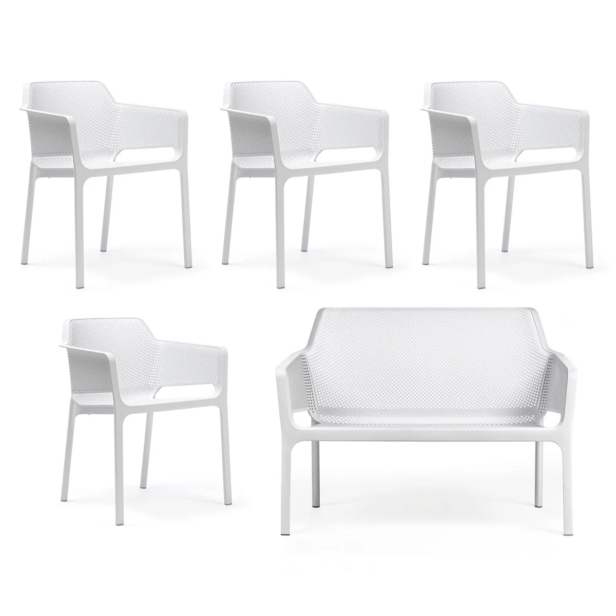 Erhältlich ist der von Raffaello Galiotto entworfene Net Armlehnstuhl in verschiedenen Farben mit Matt-Effekt, die sich hervorragend untereinander sowie mit weiteren Gartenmöbeln von Nardi kombinieren lassen. Passende Auflagekissen sind separat erhältlich.