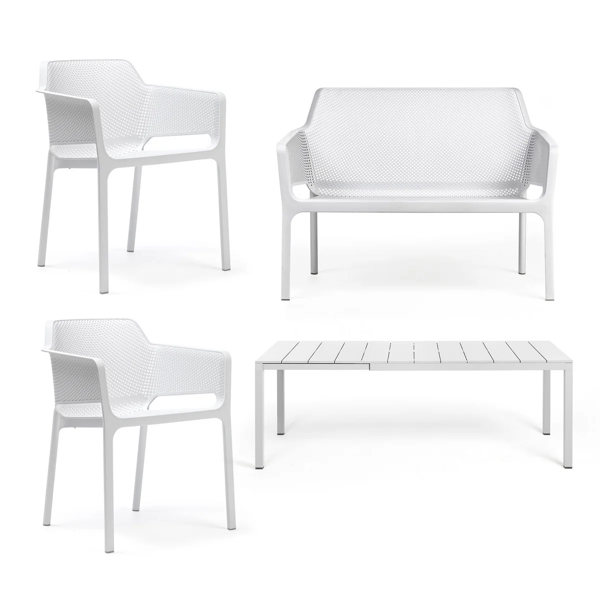 Erhältlich ist der von Raffaello Galiotto entworfene Net Armlehnstuhl in verschiedenen Farben mit Matt-Effekt, die sich hervorragend untereinander sowie mit weiteren Gartenmöbeln von Nardi kombinieren lassen. Passende Auflagekissen sind separat erhältlich.