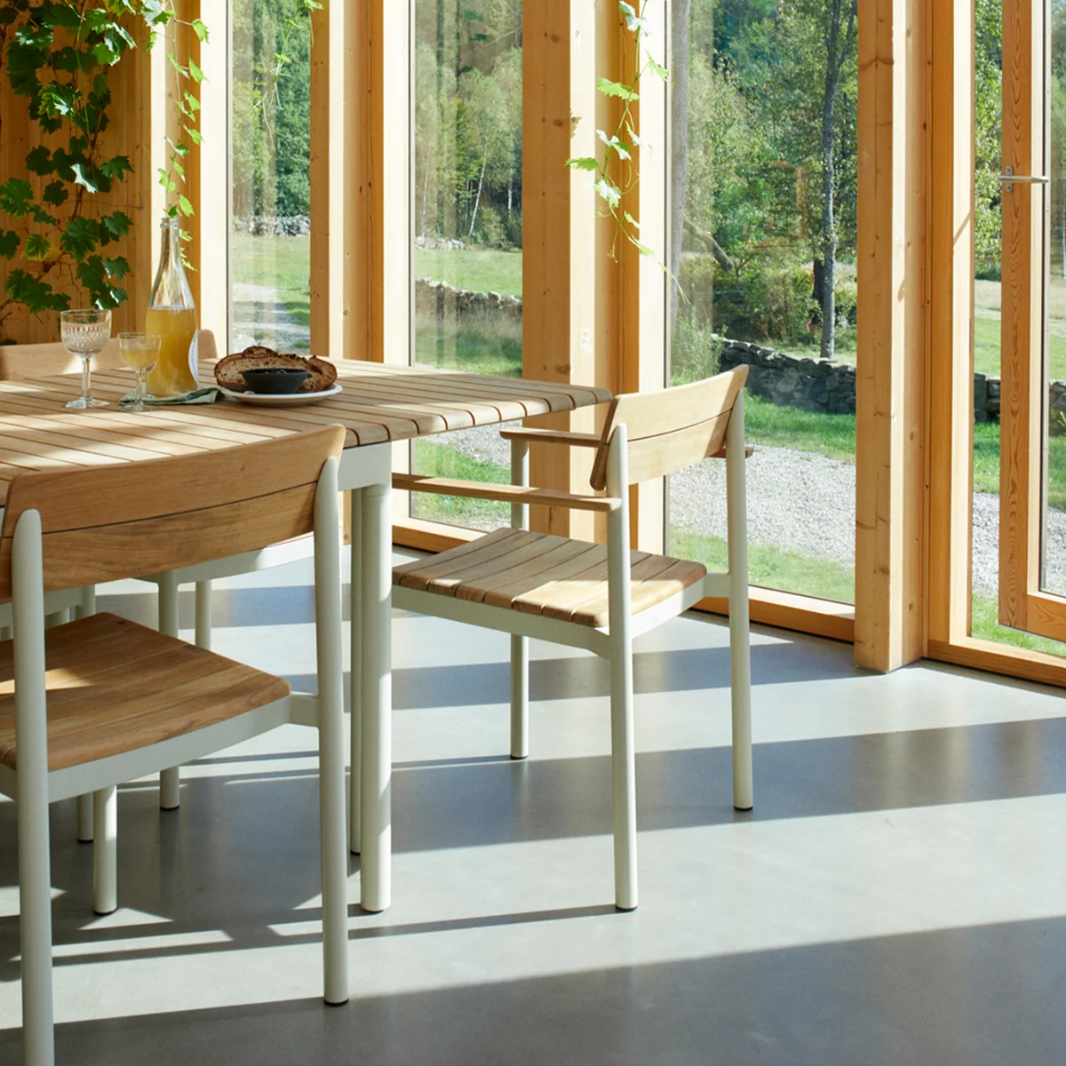 Er kann hervorragend mit dem Pelagus Tisch kombiniert werden. Der Pelagus Armlehnenstuhl wird aus Teakholz und pulverbeschichtetem Aluminium hergestellt. Er ist in den Farben Elfenbein und Jägergrün erhältlich.