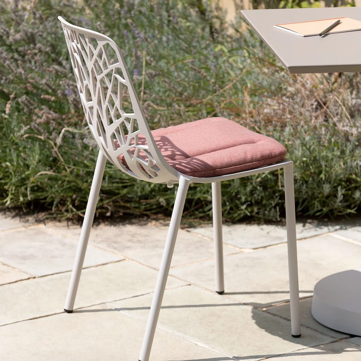 Die verästelte Struktur der Sitzschale weckt Assoziationen an einen Wald (engl. Forest), woher der filigrane Gartenstuhl auch seinen Namen bezog. Für diejenigen, die es noch bequemer mögen, gibt es auf Anfrage einseitig rutschfeste Filz-Sitzkissen für Forest.