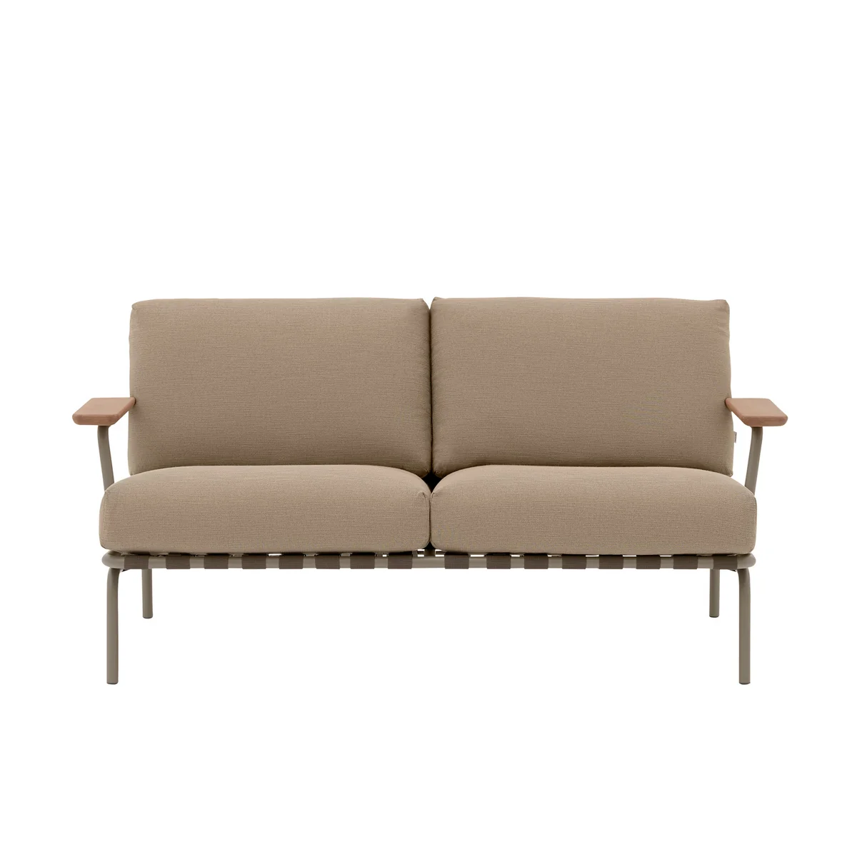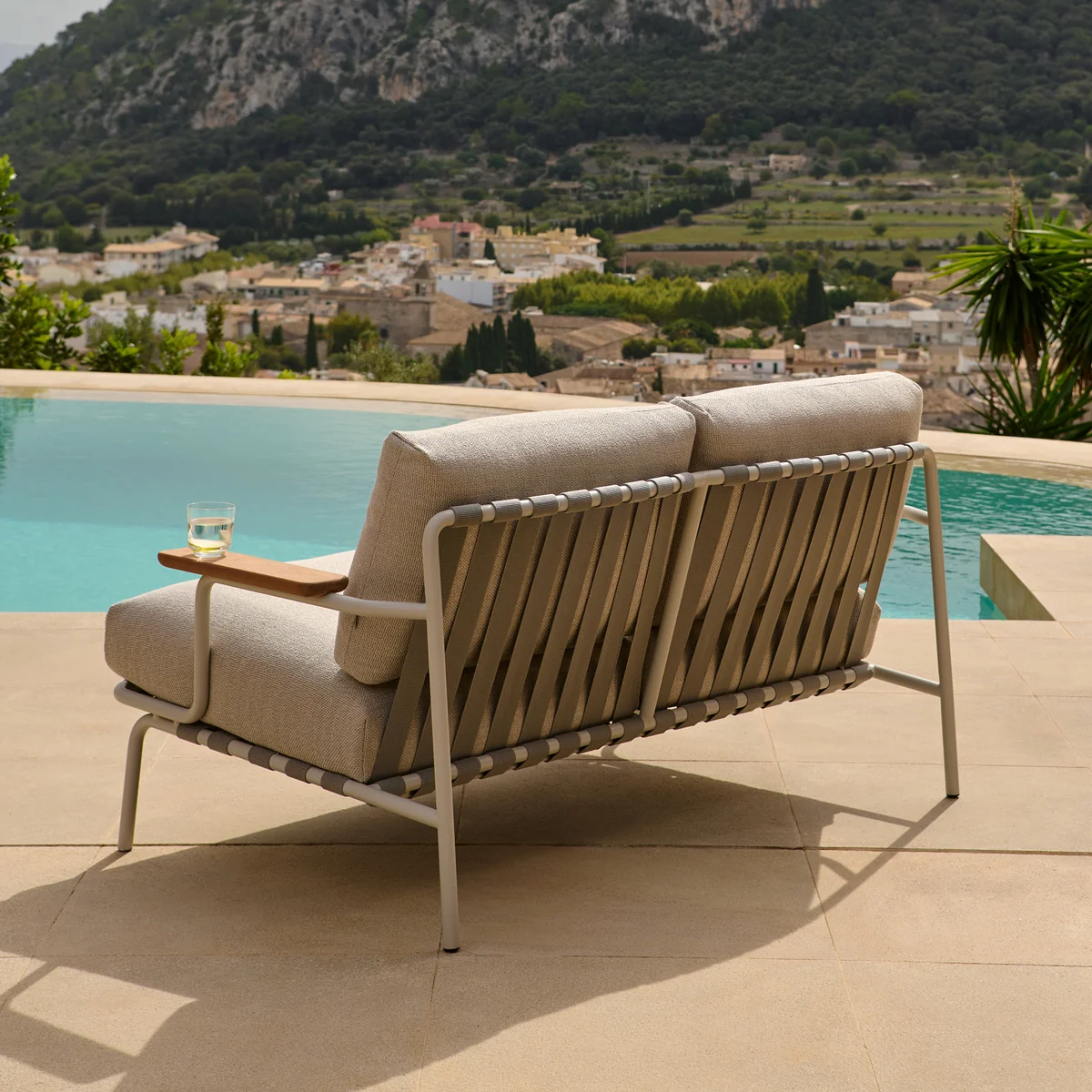 Das Settle Outdoor 2-Sitzer Sofa verbindet modernes skandinavisches Design mit langlebigem Komfort für den Außenbereich. Die luftige Stahlkonstruktion mit sichtbaren Gurtdetails verleiht dem Sofa eine leichte, elegante Optik und sorgt gleichzeitig für Stabilität und Widerstandsfähigkeit.