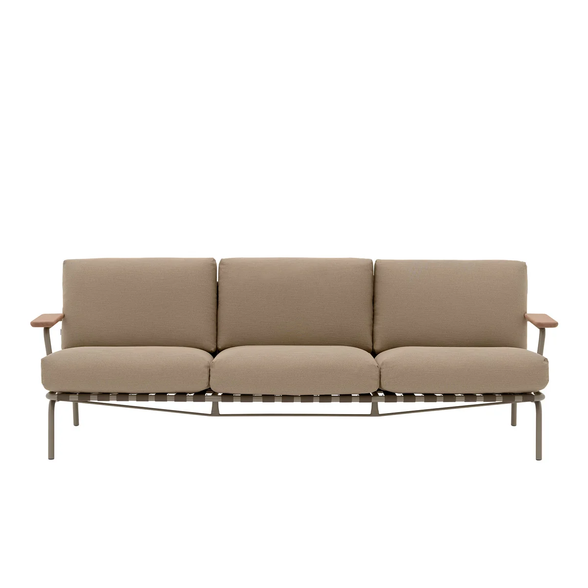 Der Rahmen aus verzinktem, grundiertem und pulverbeschichtetem Stahl sorgt für hohe Stabilität und zuverlässigen Schutz vor Korrosion. Sichtbare Gurtdetails betonen die handwerkliche Ästhetik und unterstreichen die luftige Gestaltung. Die Armlehnen aus Mahagoni setzen einen warmen, natürlichen Kontrast und dienen gleichzeitig als praktische Ablagefläche.