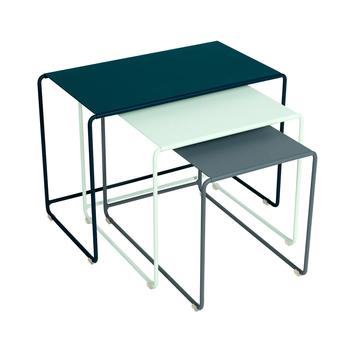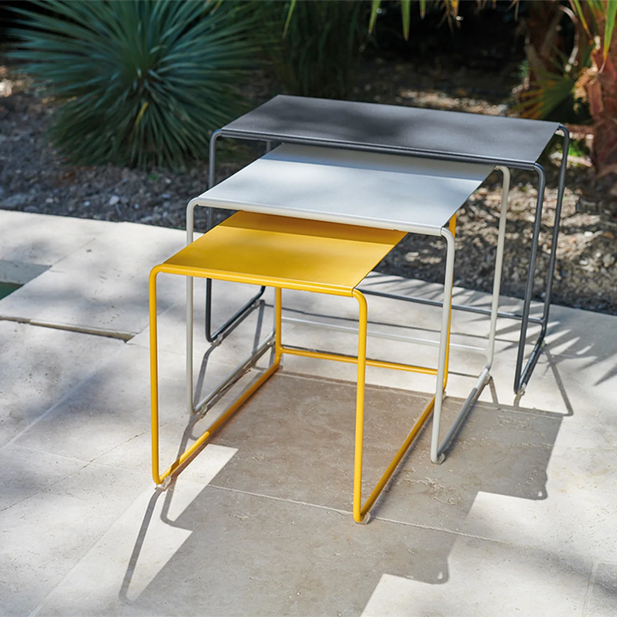 Oulala ist ein dreiteiliges Sitztisch Set des französischen Herstellers Fernmob. Es begeistert mit seinen bunten Farbvariationen in anthrazit / lehmgrau / honig, opalgrün / gletscherminze / zitronensorbet und rosmarin / kaktus / chili. Die Tische werden aus pulverbeschichtetem Stahl hergestellt und sind innerhalb des Sets in den Größen 55 x 40 x 30 cm, 50,5 x 34 x 30 cm und 40 x 40 x 37 cm erhältlich. Das Oulala Set umfasst ein Gewicht von 11 kg und wird in Europa hergestellt.
