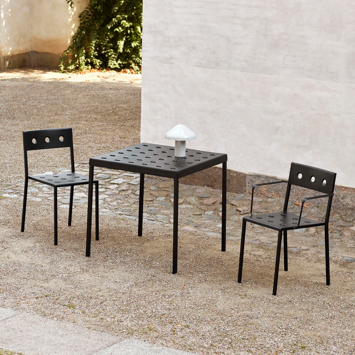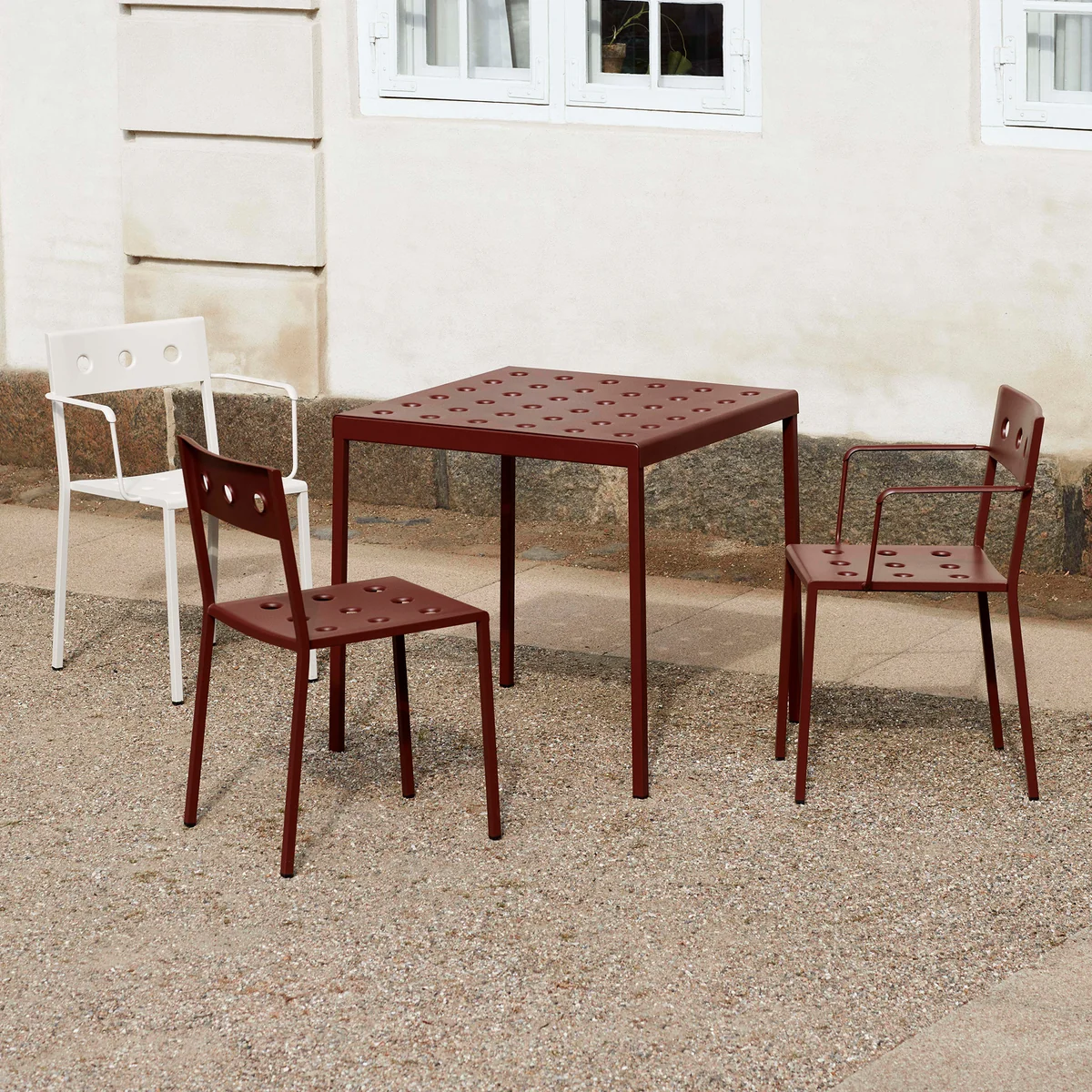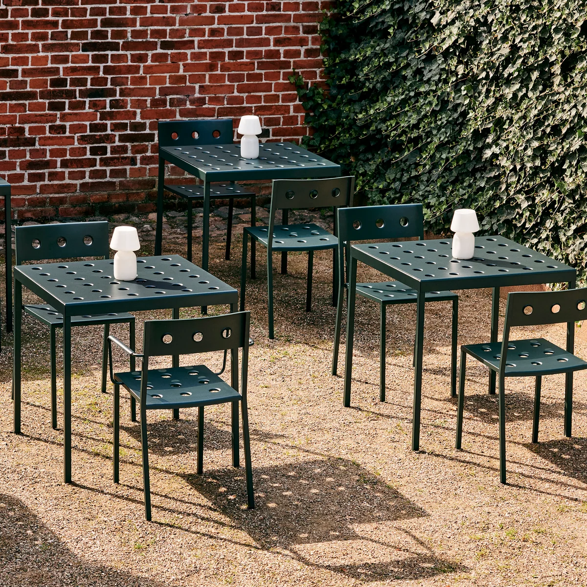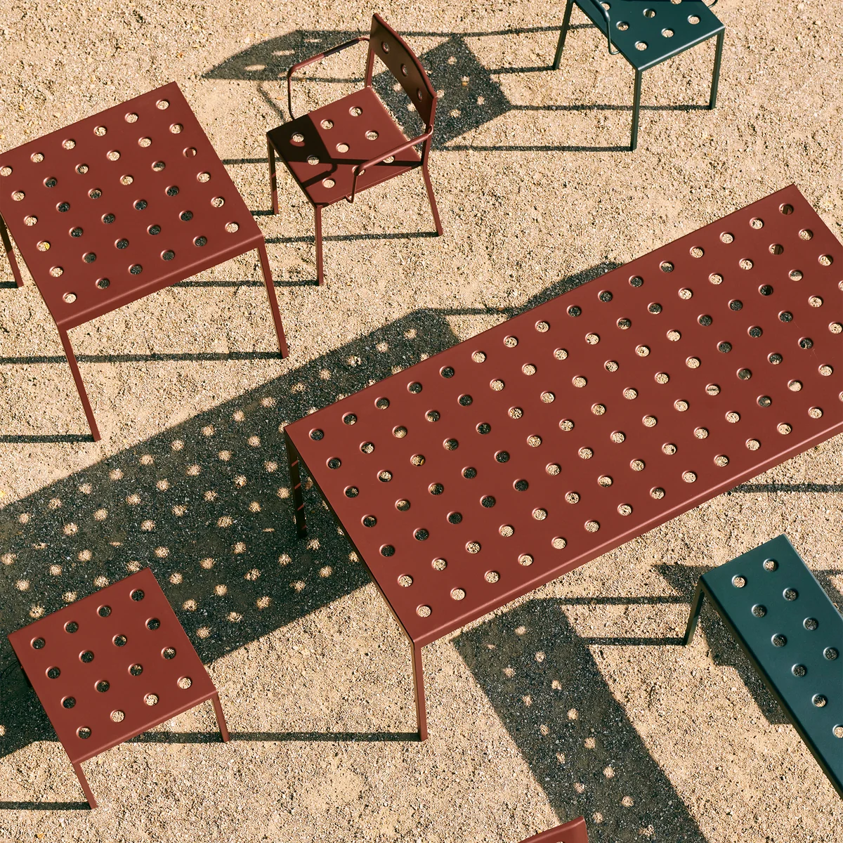 Der Balcony Esstisch von Ronan und Erwan Bouroullec für HAY ist ein eleganter Esstisch für den Außenbereich. Das schlichte, rechteckige Design erhält durch seine schlanken Beine einen lockeren Touch. Die zahlreichen Löcher auf der Tischoberfläche verleihen der Konstruktion Stabilität, wodurch zugleich ein besonderer Ausdruck entsteht. Balcony wird aus pulverbeschichtetem Stahl gefertigt und ist mit einer Beschichtung versehen, welche optimale Widerstandsfähigkeit und Langlebigkeit gewährleistet. So kann der Esstisch ideal im Außenbereich genutzt werden.