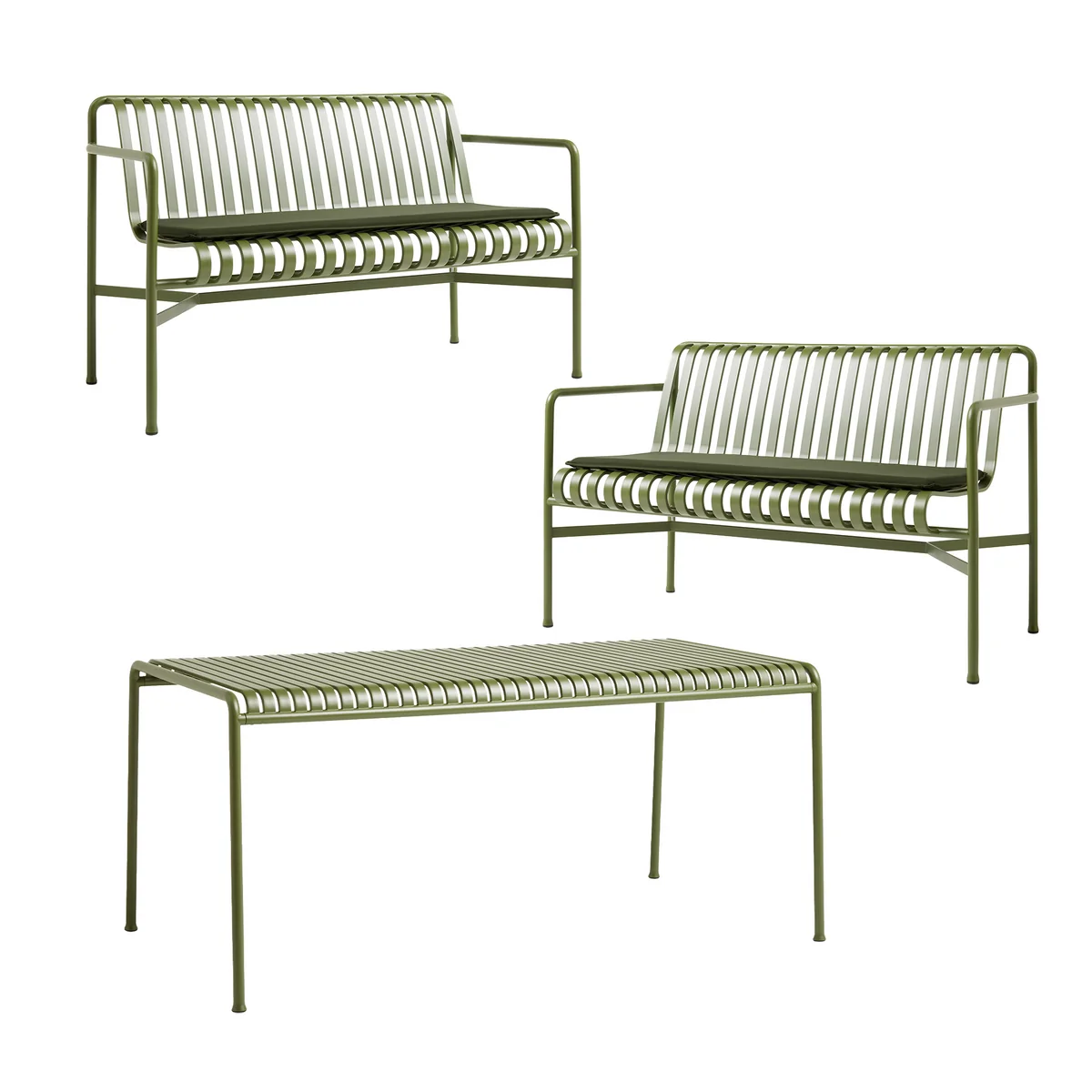Die Palissade Dining Bank von HAY ist eine Gartenbank, die sich hervorragend für gemütliche Grillabende im Garten eignet. Mit der Rücken- und den Armlehnen bietet die Bank einen hohen Komfort. Dabei erlaubt die ergonomische Form der Bank - auch ohne Polsterung - ein bequemes Zurücklehnen.