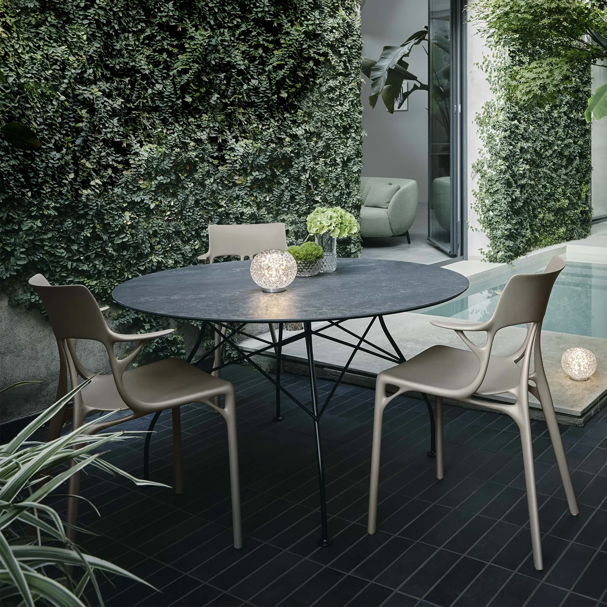 Der Glossy Outdoor Tisch wurde von Antonio Citterio für Kartell entworfen. Die neue Oberflächenausführung aus Feinsteinzeug erweitert diese ikonische Tischfamilie und macht sie Outdoorfähig. Das filigrane Gestell aus lackiertem Stahl, das die Beine auf jeder der vier Seiten verbindet, ist ein charakteristisches Merkmal der Serie.
