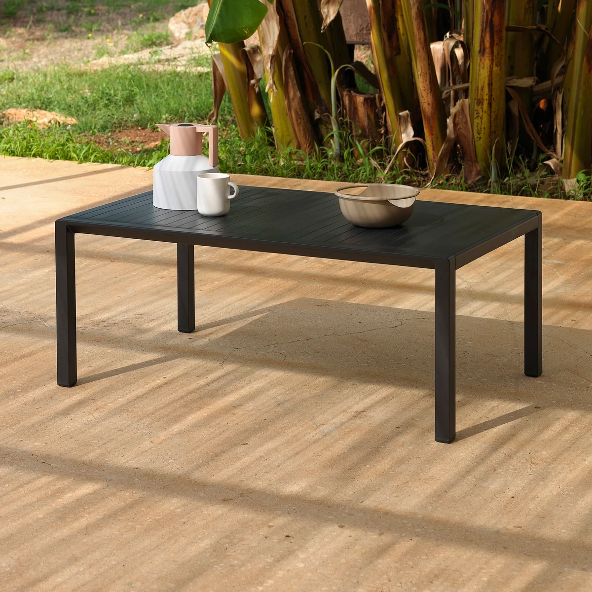 Tischplatte sowie Beine sind aus epoxiertem Aluminium gefertigt sind damit hervorragend für die Nutzung im Außenbereich geeignet. Das Material ist resistent gegenüber jeglicher Witterung. Die Tischplatte ist lattenförmig angeordnet, sodass anfallendes Regenwasser einfach abfließen kann und sich keine lästigen Pfützen bilden. Praktisch ist zudem, dass sich die Höhe der Füße angleichen lässt. So findet der Tisch auch auf unebenen Terrassen einen festen, gleichmäßigen Stand.