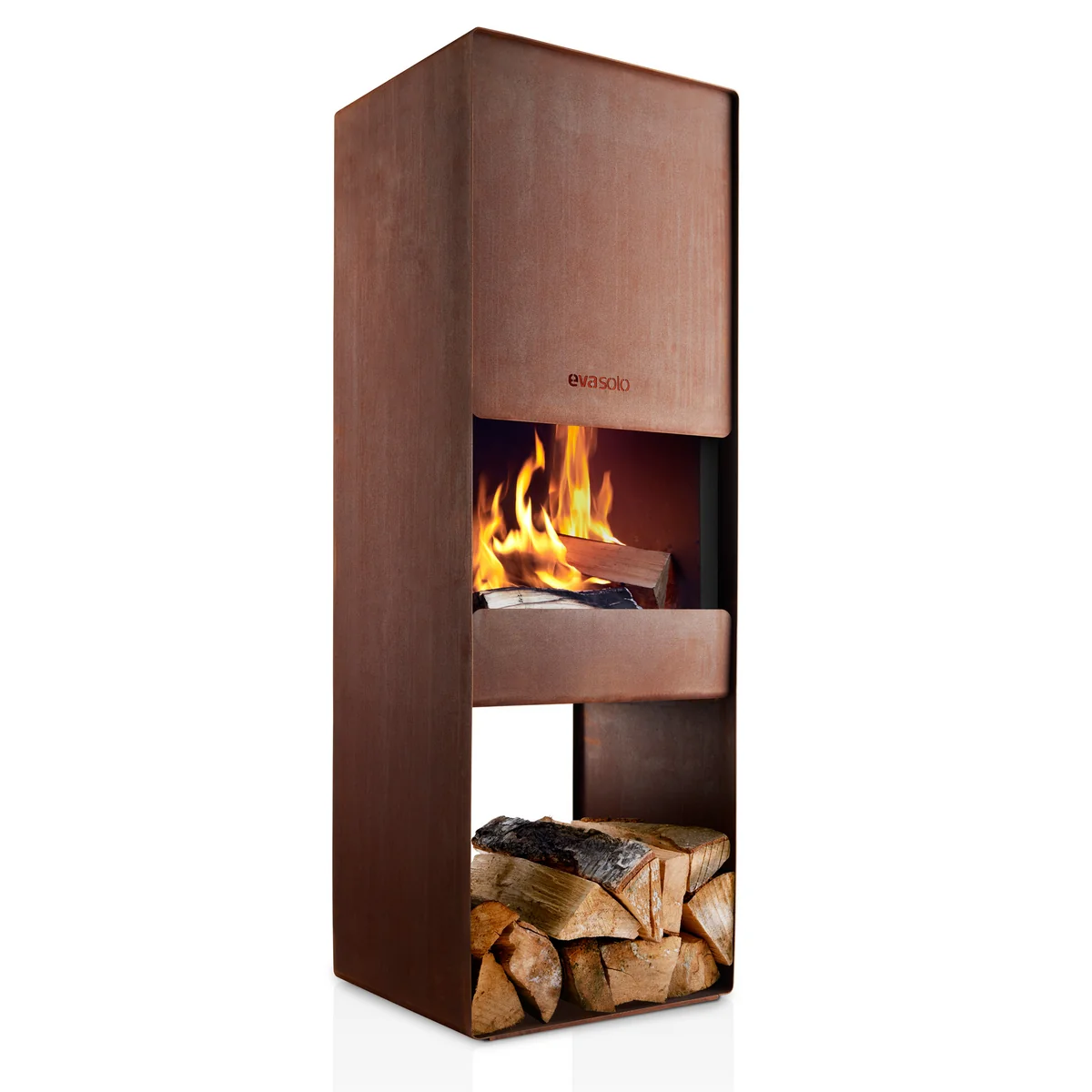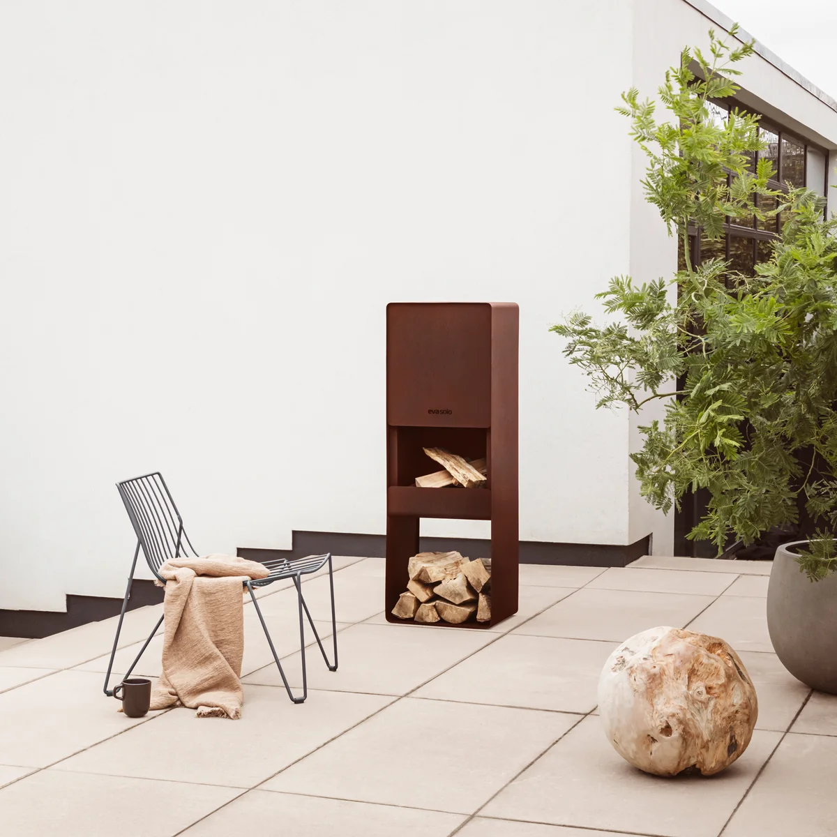 Mit der Firebox von Eva Solo lässt sich auch an kühlen Sommernächten ein warme, gemütliche Atmosphäre im Garten schaffen. Die kastige, aus Cortenstahl gefertigte Feuerstelle ist hervorragend für den Outdoor-Bereich geeignet und hält aufgrund seiner Beschichtung Hitze problemlos stand. Während auf der unteren Ebene Feuerholz gelagert werden kann, befindet sich eine Etage darüber der Kamin. Durch einen integrierten Schornstein kann der Qualm nach oben abziehen, ohne den Nutzer zu stören. Sein schlichtes, zeitloses Design fügt sich bestens auf jede Terrasse und in jeden Garten ein und setzt moderne Akzente.