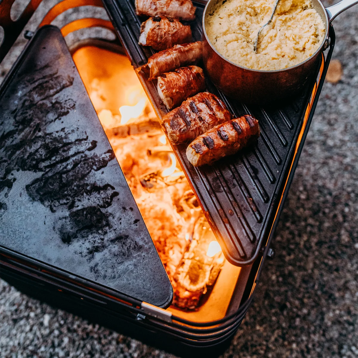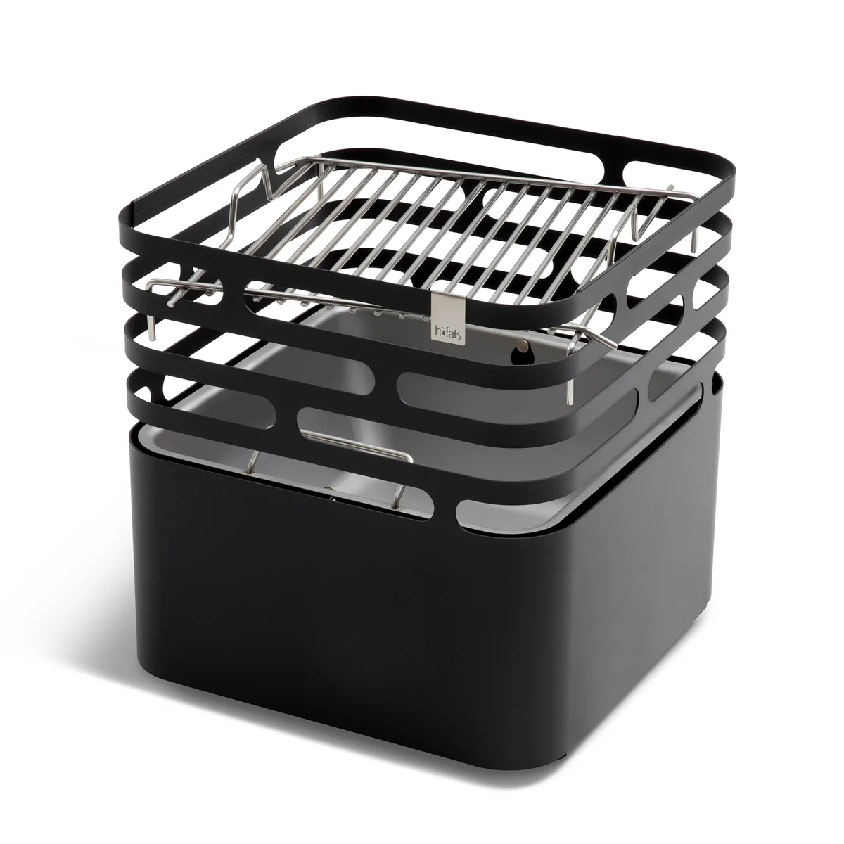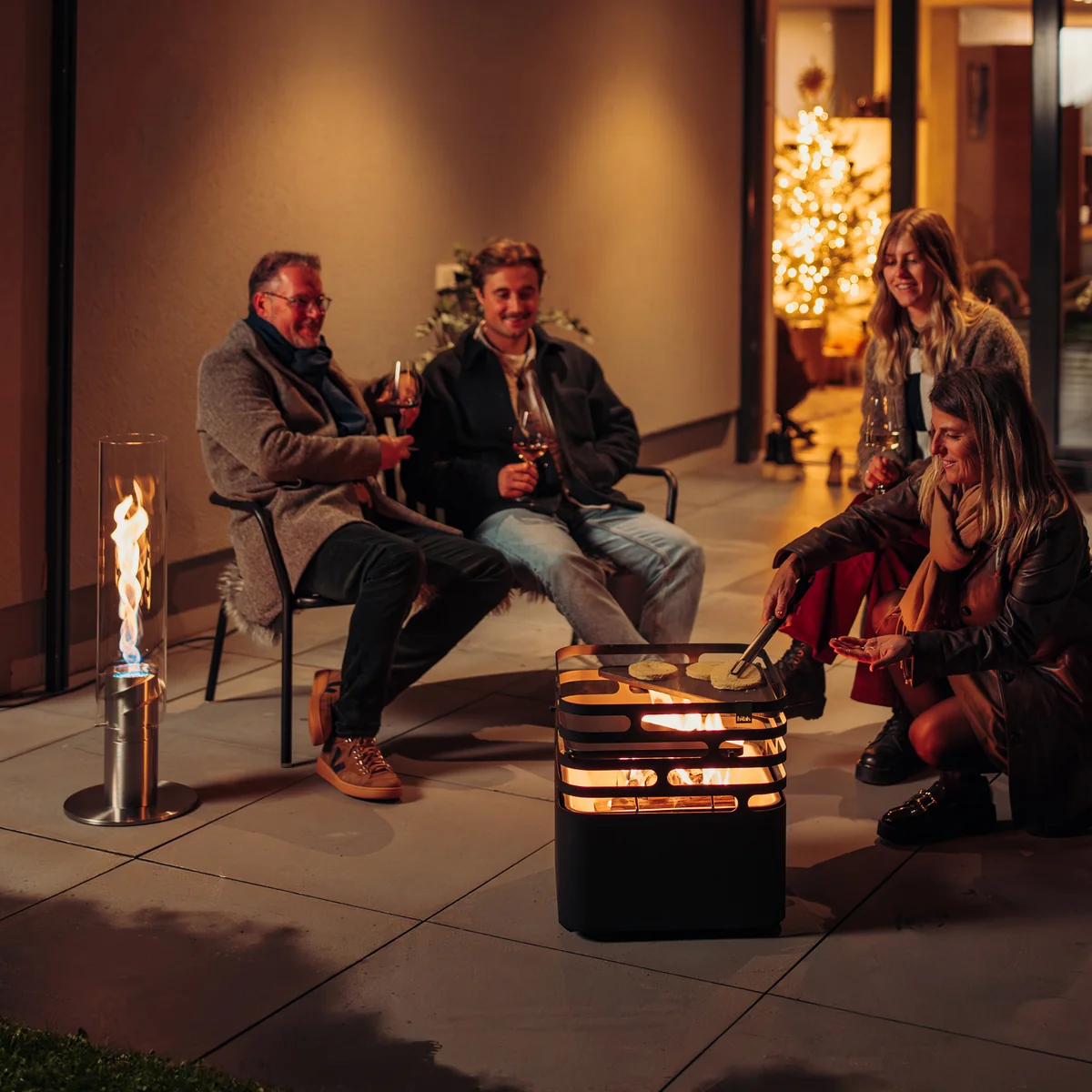 Lodert in Cube gerade kein Feuer, ist er Hocker, Bank oder Beistelltisch. Optional ist ein passender Grillrost erhältlich - selbstverständlich ist dieser höhenverstellbar. Ebenfalls gehört ein Abdeckbrett zum erhältlichen Zubehör.
