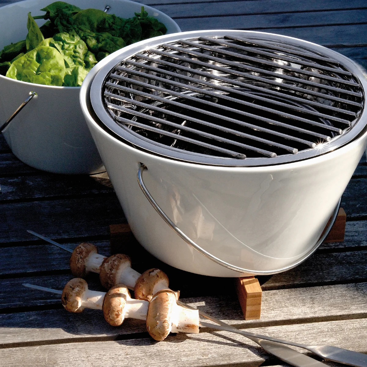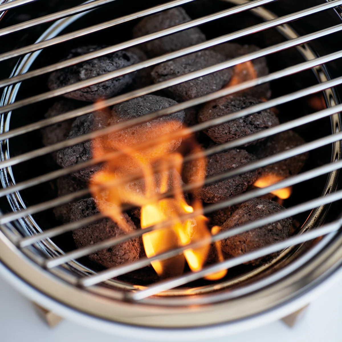 Einfach den Porzellan-Grill mit der durchgeglühten Holzkohle in dem separaten Kohlebehälter komplett auf den Tisch stellen und schon kann es losgehen: Schalentiere, Chicken Wings, Pilze und vieles mehr lassen sich ganz einfach und dekorativ zubereiten.