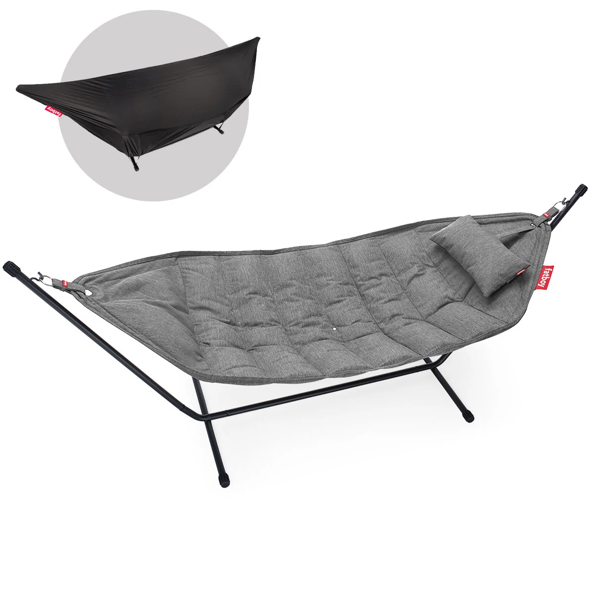 Die Headdemock Hängematte Superb Deluxe von Fatboy verfügt neben der Matte selbst über ein bequemes Kopfkissen, ein stabiles Gestell und eine schützende Abdeckung. Sie ist für zwei Personen geeignet (max. 150kg) und nicht auf ein Seil oder einen Baum angewiesen.