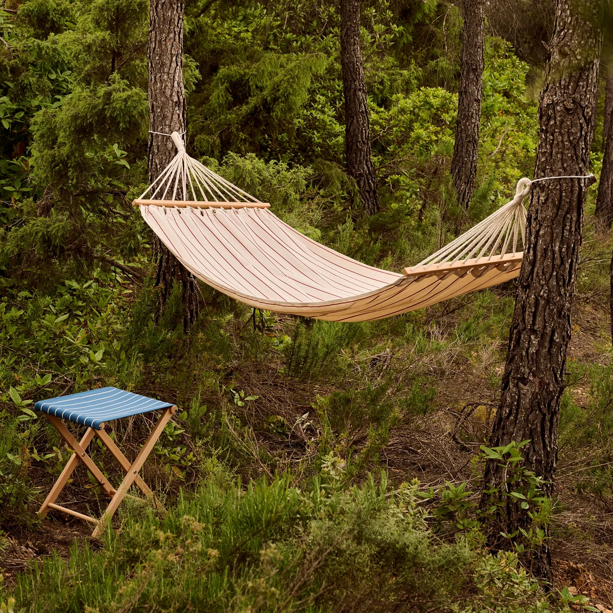 Die Outdoor Market Hängematte bringt Komfort sowie stilvolle Leichtigkeit in den Außenbereich. Gefertigt aus recyceltem Polyester und mit Endstücken aus Buchenholz versehen, vereint die Hängematte robuste Materialien mit natürlicher Ästhetik. Dank der Seilbefestigung lässt sie sich einfach zwischen Bäumen oder geeigneten Halterungen anbringen – ideal zum Entspannen oder für ein Nickerchen im Freien. Für bequemen Transport und praktische Aufbewahrung wird die Hängematte in einer passenden Stofftasche mit Griffen geliefert.