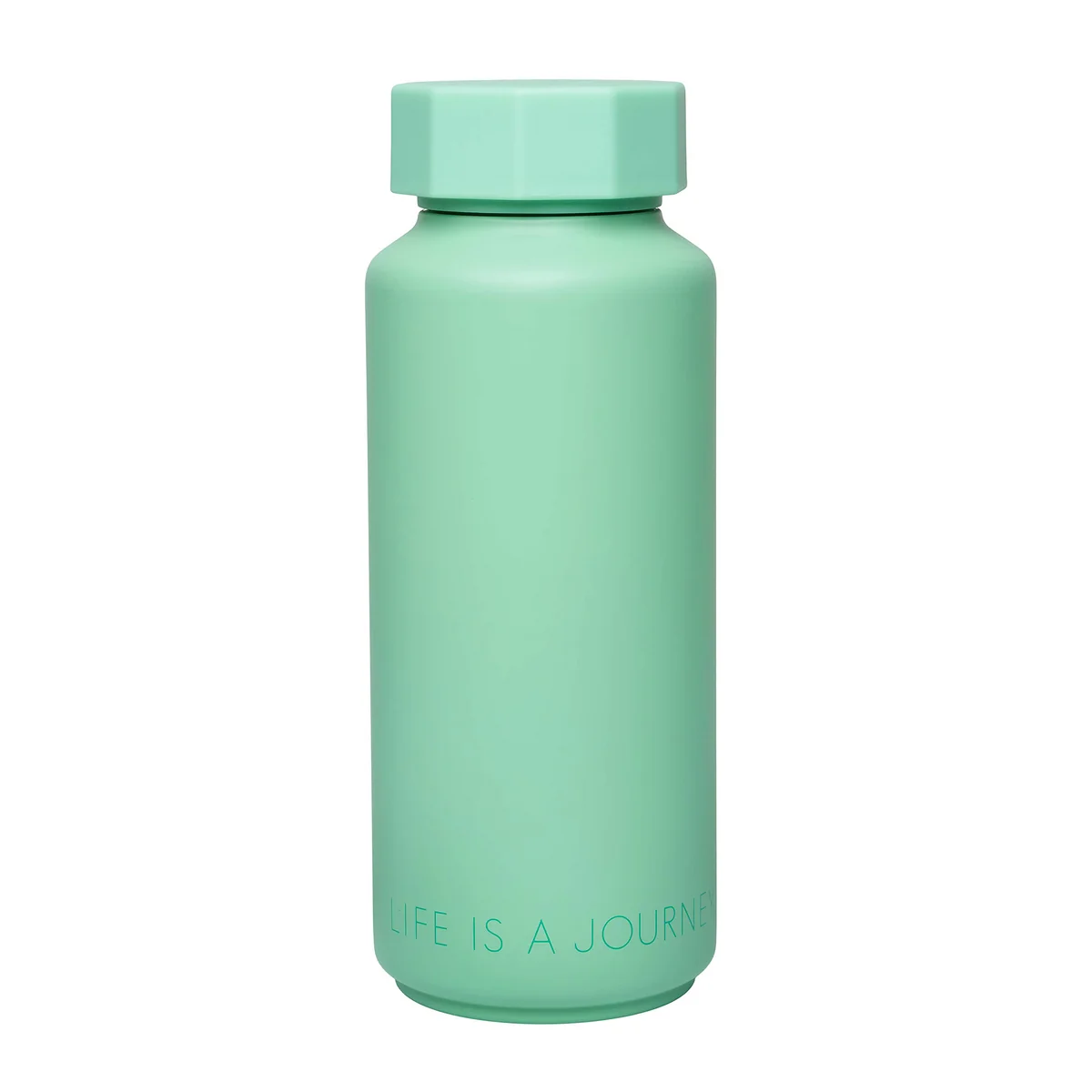 Das Design der Thermosflasche erscheint im stilvollen Retro-Look mit verschiedenen Aufschriften in verschiedenen Farben. Die Typografie stamm von Arne Jacobsen und wurde bereits 1937, ursprünglich zur Beschilderung des Rathauses in Aarhus, entworfen. Das schnörkellose Design hat auch bis heute nichts von seinem Charme verloren und ziert nun unter anderem zahlreiche Produkte von Design Letters.