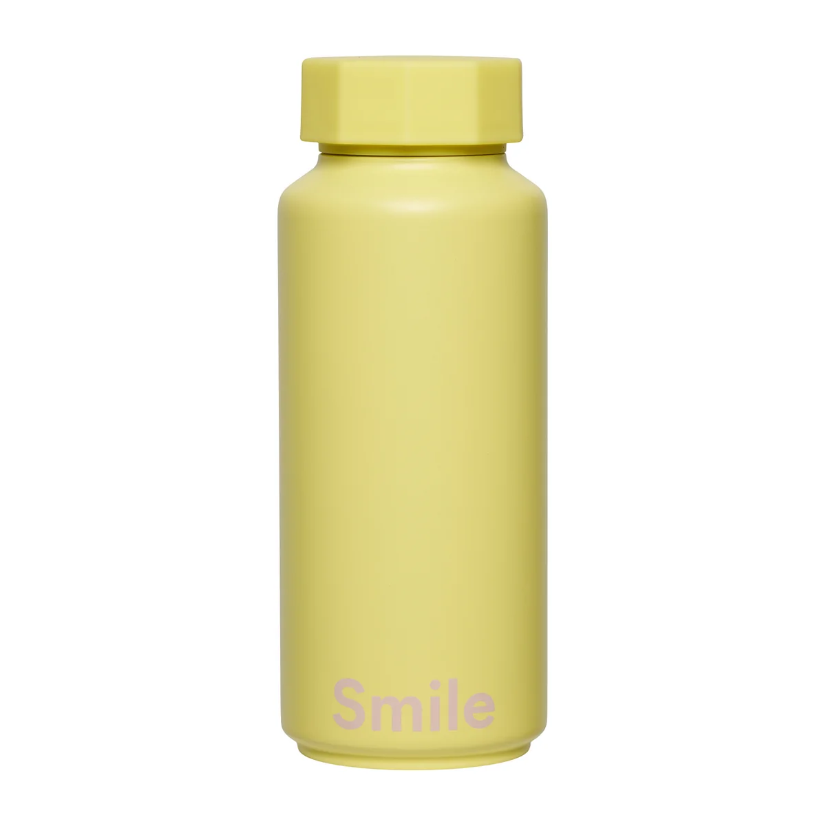 Das Design der Thermosflasche erscheint im stilvollen Retro-Look mit verschiedenen Aufschriften in verschiedenen Farben. Die Typografie stamm von Arne Jacobsen und wurde bereits 1937, ursprünglich zur Beschilderung des Rathauses in Aarhus, entworfen. Das schnörkellose Design hat auch bis heute nichts von seinem Charme verloren und ziert nun unter anderem zahlreiche Produkte von Design Letters.