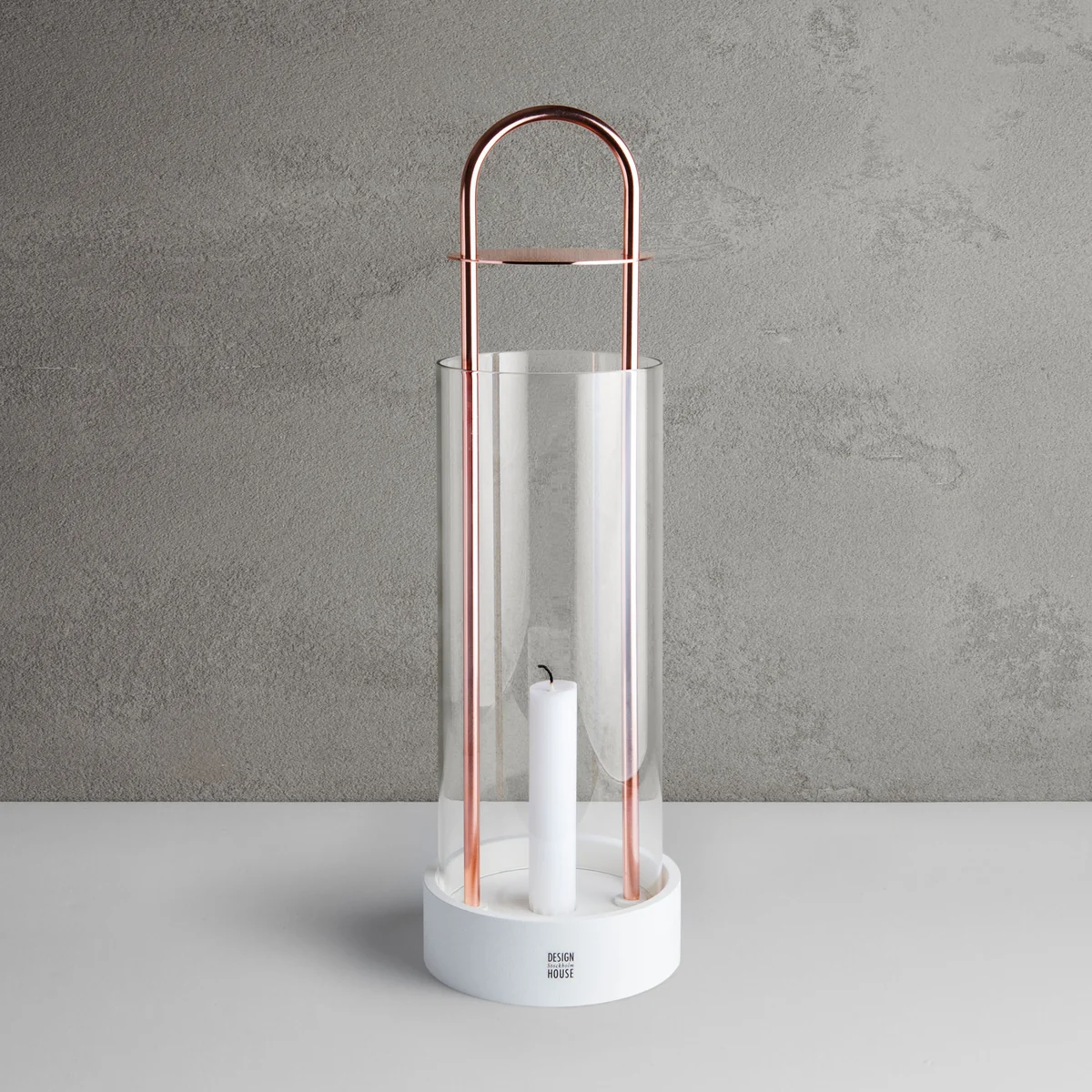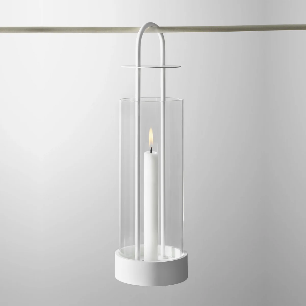 An dem schlanken Metallbogen, der sich vom Boden des Windlichts hoch über die Kerze und die Glasröhre erstreckt, lässt sich das Windlicht entweder tragen oder aufhängen.