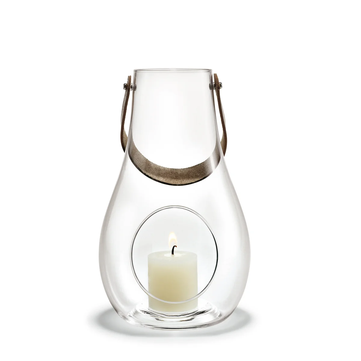 Die Windlichter mit Lederhenkel von Holmegaard wurden in durchsichtigem bzw. matt-weißem Glas gestaltet. Durch die tropfenförmige Mitte können je nach Bedarf Teelichter oder Blockkerzen hineingestellt werden.