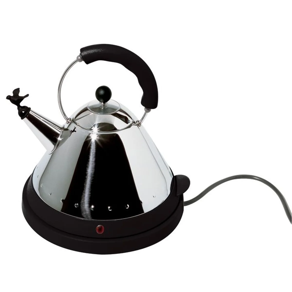 1984 schuf Michael Graves den heute legendären "Bird Kettle". Es war das erste Produkt, das ein amerikanischer Designer für Alessi entwarf. Der MG32 Wasserkocher ist ein modernes Abbild eben jenes Vogelflöten-Kessels - mit dem Unterschied, dass er das Wasser per Elektronik erhitzt und nicht an Herd oder Kochplatte gebunden ist.
