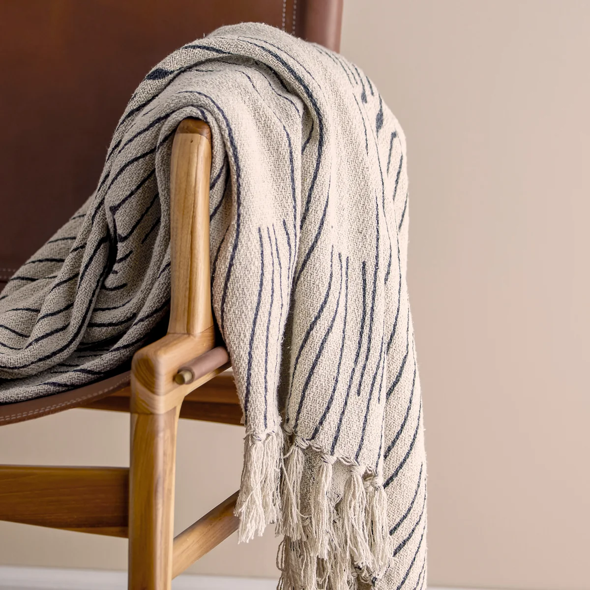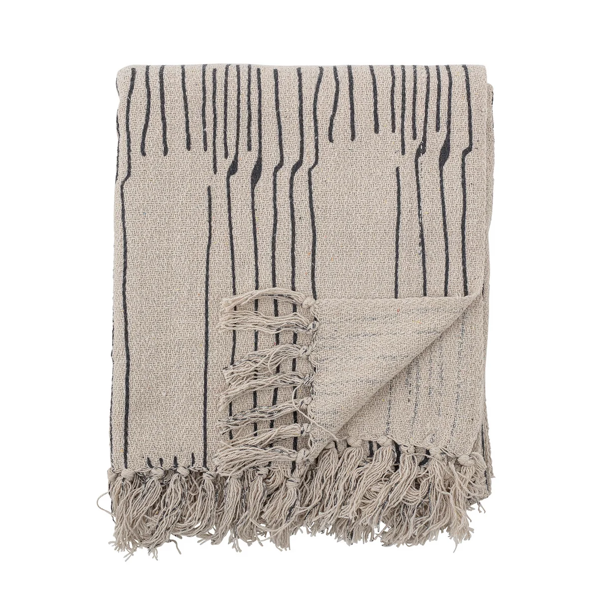 Die Celly Tagesdecke von Bloomingville präsentiert sich in natürlichen Farben mit schwarzen Linien. Die Decke wird aus recycelter Baumwolle gefertigt und wird dadurch besonders weich. Sie eignet sich wunderbar zum Einkuscheln auf dem Sofa oder als Überwurf für das Bett im Schlafzimmer. Ein liebevolles Detail sind die feinen Fransen, mit denen die 130 x 160 cm große Decke eingefasst ist.