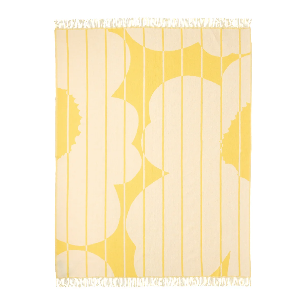 Die Vesi Unikko Wolldecke von Marimekko ist im Jacquard-Strickverfahren hergestellt und an den Enden mit Fransen verziert. Auf der Rückseite sind die Farben des Musters invertiert. Dieses Produkt erinnert an den 60. Jahrestag des Unikko-Musters und trägt stolz das Jubiläumsetikett.